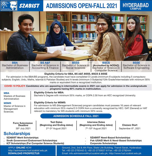 Shaheed Zulfiqar Ali Bhutto Institute of Science and Technology SZABIST Karachi is pursuing Applications from candidates in Admissions for BBA in Bachelor of Business Administration, BS A&F, BSSS, BSCS, BSSE, MBA and MSMS. Test will be conducted on 2nd-3rd August 2021 for Fall Session 2021. Classes are commencing from September 06, 2021. Admissions are open.