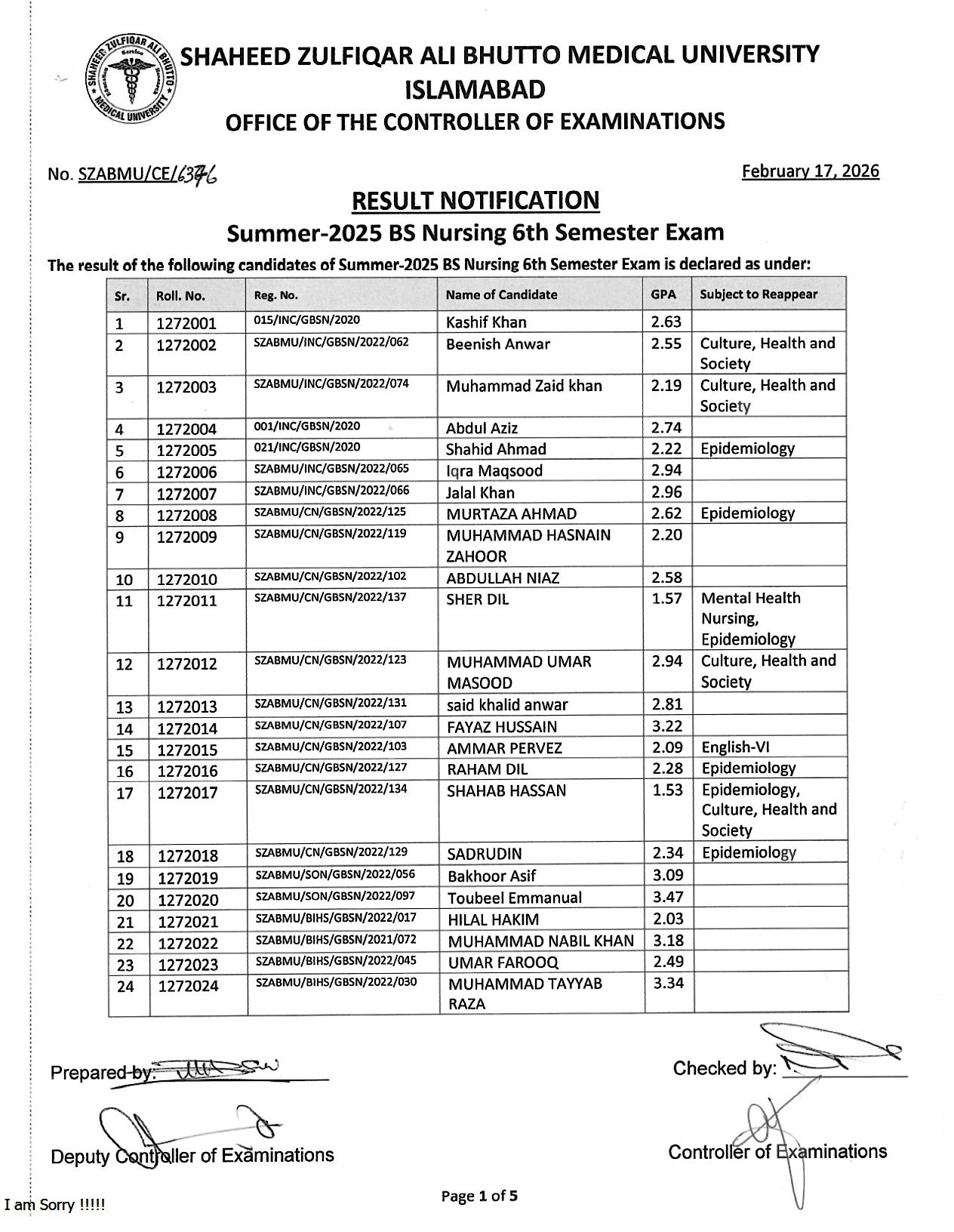 SZABMU 2026 Notification: BS Nursing 6th Semester Result Declared
