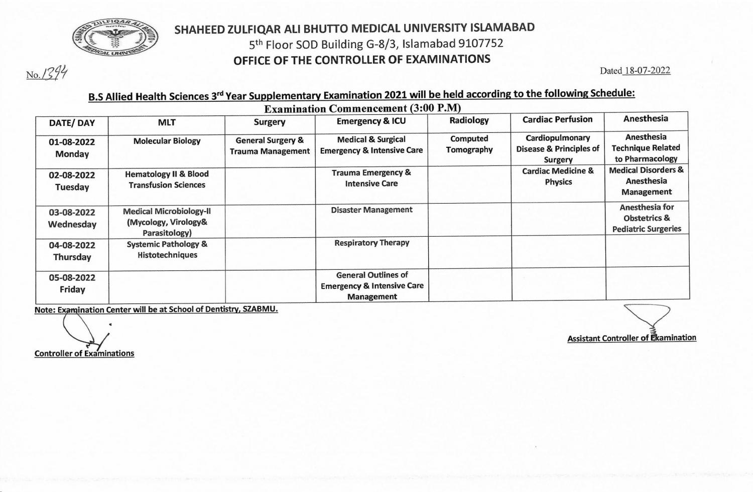Shaheed Zulfiqar Ali Bhutto Medical University Islamabad Examinations Department is going to begin their SZABMU BS Allied Health Sciences. For arrangement of SZABMU Islamabad examinations section of SZABMU has updated the SZABMU 3rd Year BS AHS Supply Exam 2021 Datesheet 2022. SZABMU BS Allied Health Sciences Supplementary Examination 2021 is starting the SZABMU 3rd Year BS Allied Health Sciences Supply Exam Schedule 2022 as SZABMU Islamabad 3rd Year BS Allied Health Sciences Supply Exam 2021 Datesheet 2022 is decided. Exam will be started in August. Candidates shall be appeared in Examinations according to announced Shaheed Zulfiqar Ali Bhutto Medical University BS AHS Supply Exam 2021 Schedule 2022 from August 01, 2022. Any change can be made in Date Sheet according to unforeseen situation or further Government order.