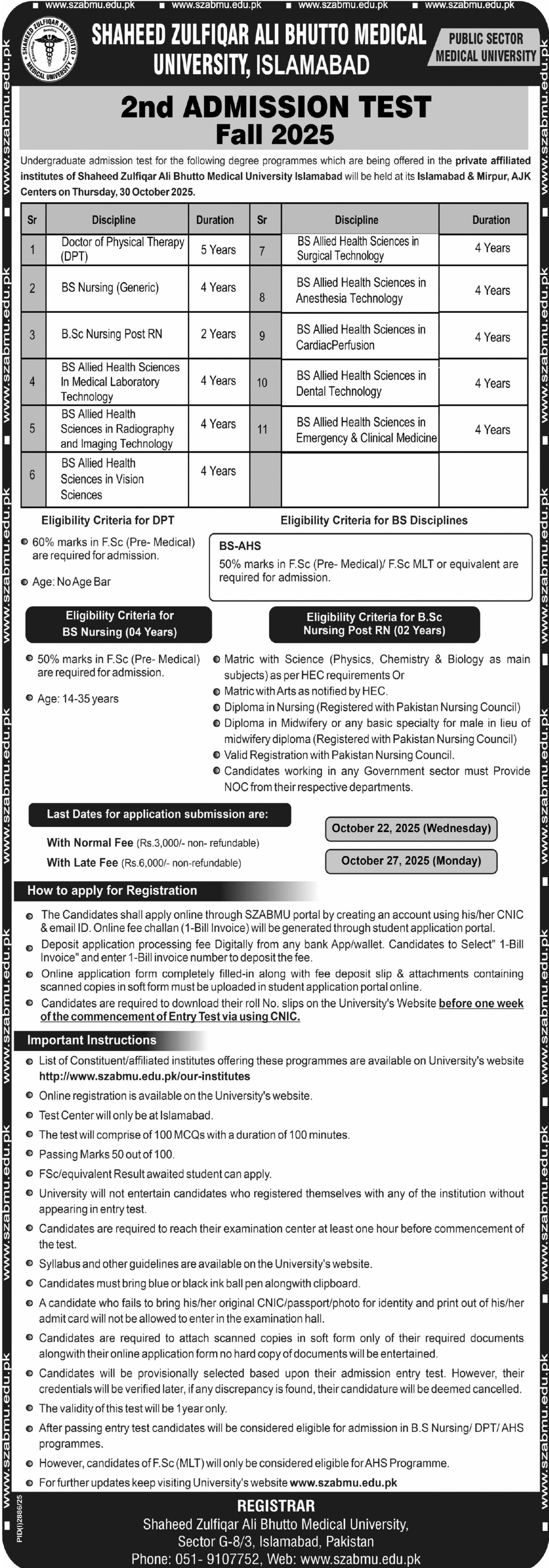 Shaheed Zulfiqar Ali Bhutto Medical University SZABMU, Islamabad, invites applications for the Second Entry Test for Fall 2025 Admissions in various undergraduate degree programs offered through Private Affiliated Institutes.
