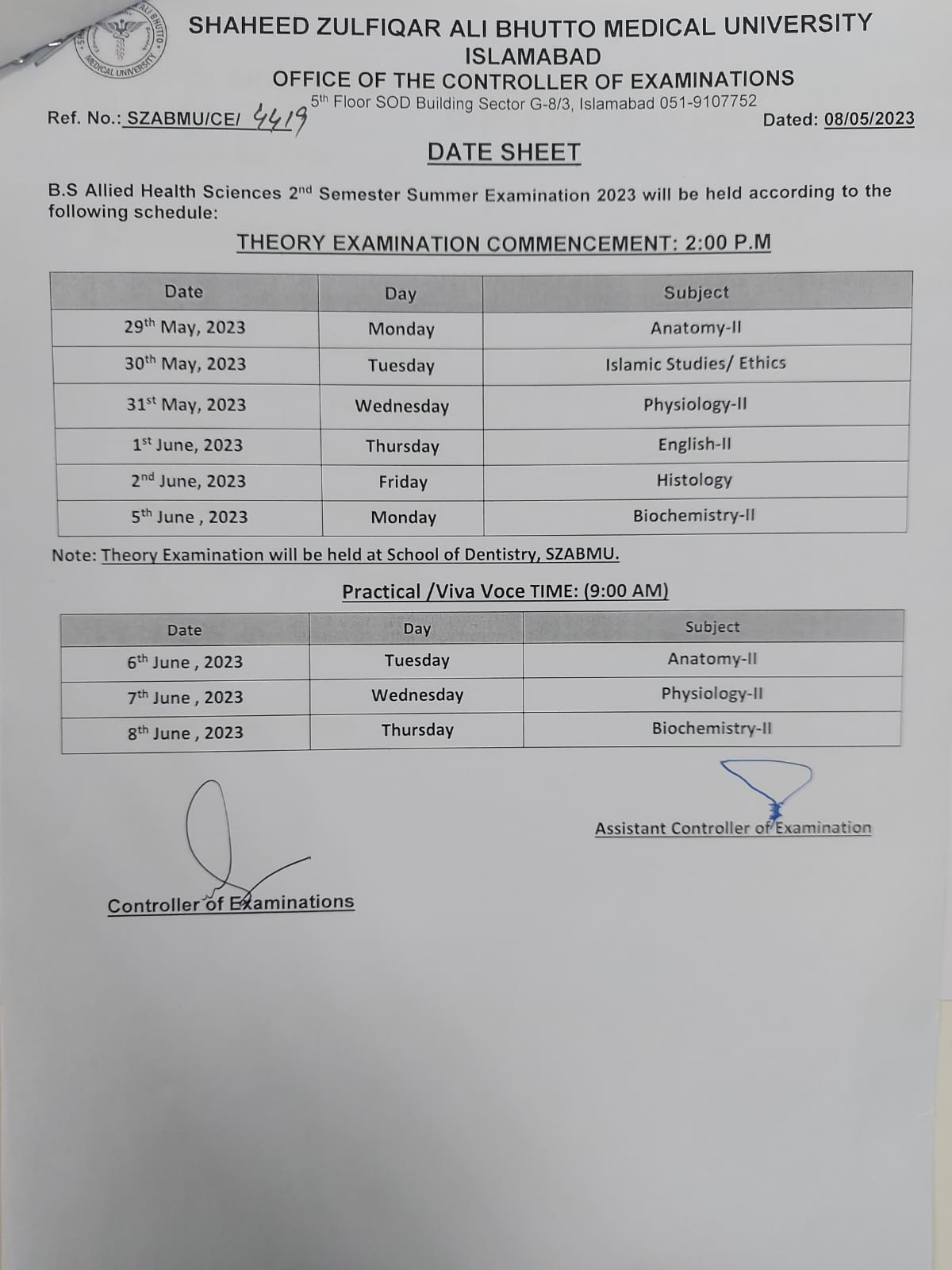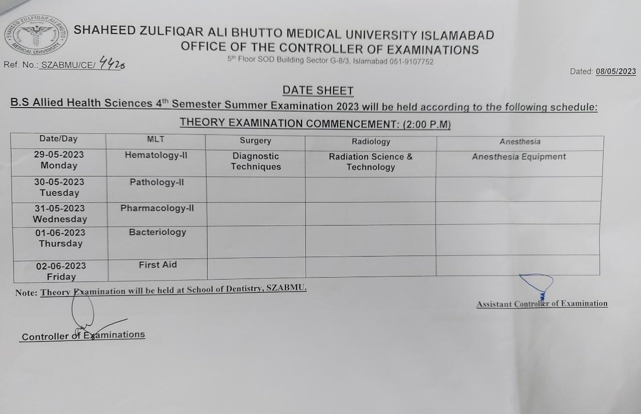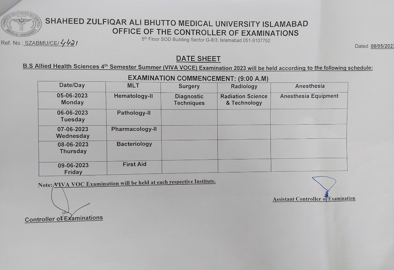 Shaheed Zulfiqar Ali Bhutto Medical University has released the date sheet for the SZABMU AHS 2nd and 4th Semester Summer Exam 2023. The exams will commence on 29th May 2023 and will conclude on 9th June 2023. This SZABMU date sheet 2023 provides a clear schedule for students pursuing the Allied Health Sciences program. It allows them to plan their studies and prepare effectively for their exams.