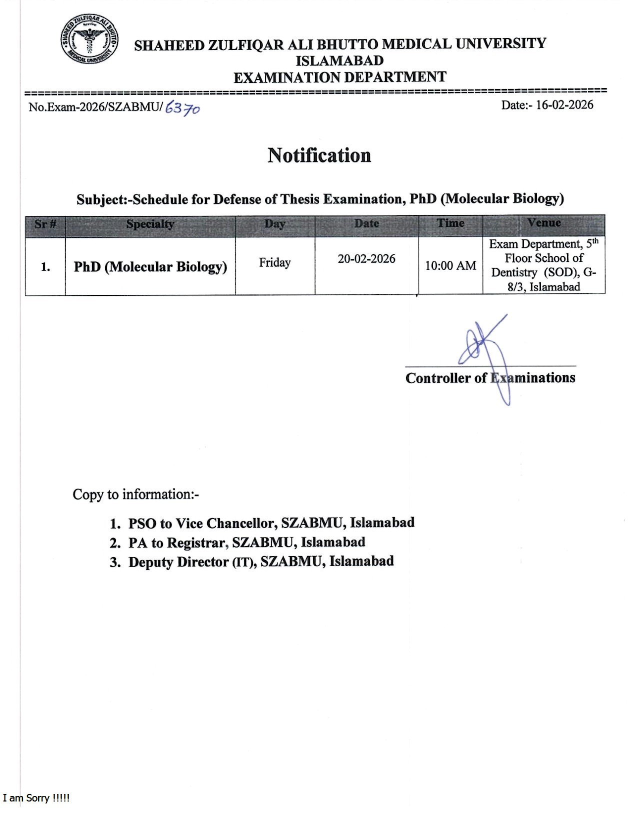 A major academic update has arrived from Shaheed Zulfiqar Ali Bhutto Medical University Islamabad SZABMU as the university officially announced the schedule for defense of thesis examination, PhD Molecular Biology for 2026. This important notification has sparked attention among doctoral scholars and research enthusiasts who have been closely following SZABMU PhD updates. The release of the thesis defense schedule marks a significant milestone in the academic journey of PhD candidates specializing in Molecular Biology.