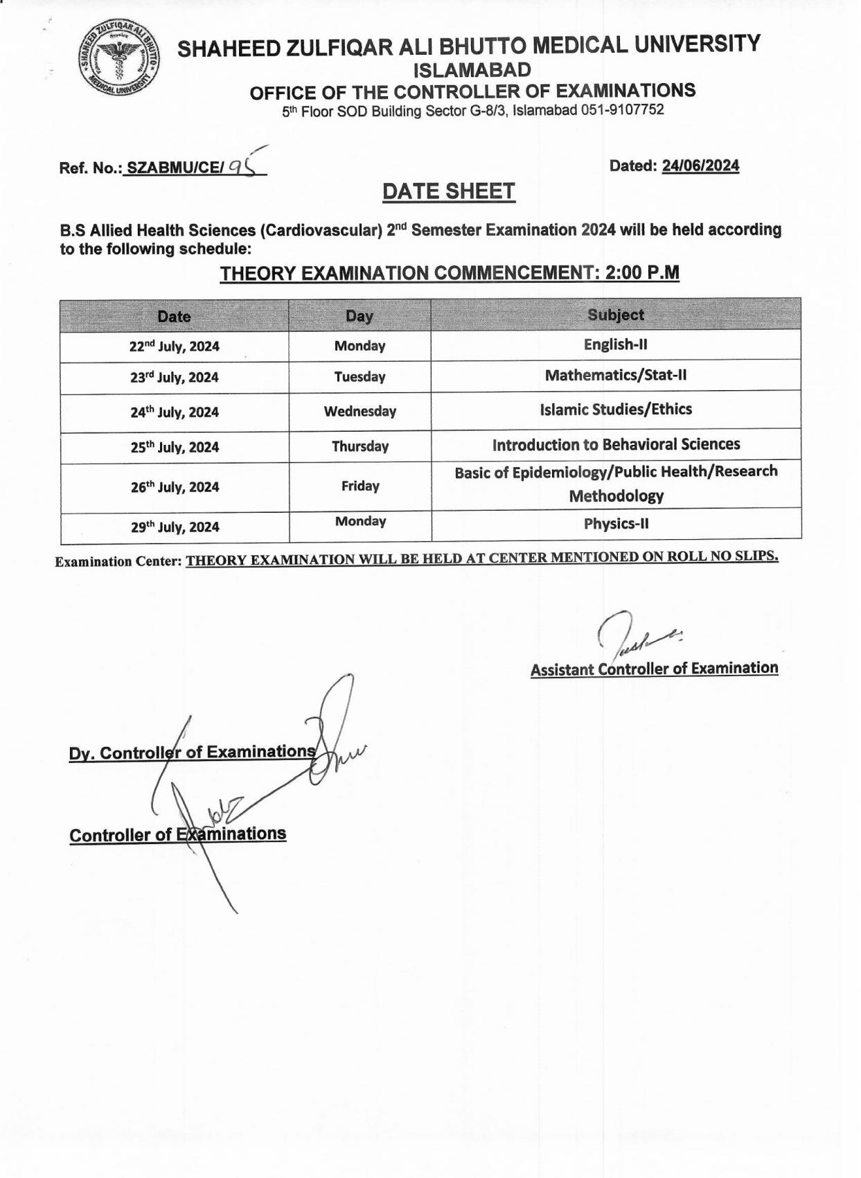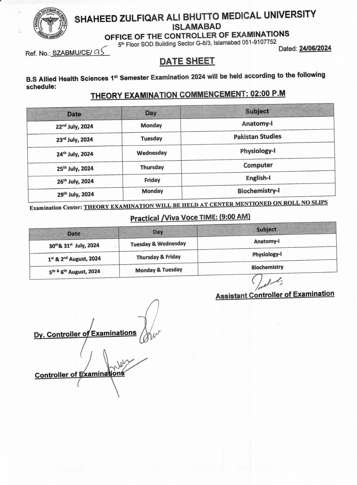 Shaheed Zulfiqar Ali Bhutto Medical University SZABMU has announced the Date Sheet 2024 for the BS Allied Health Sciences AHS program. This comprehensive schedule ensures students are well-informed about their upcoming examinations.
