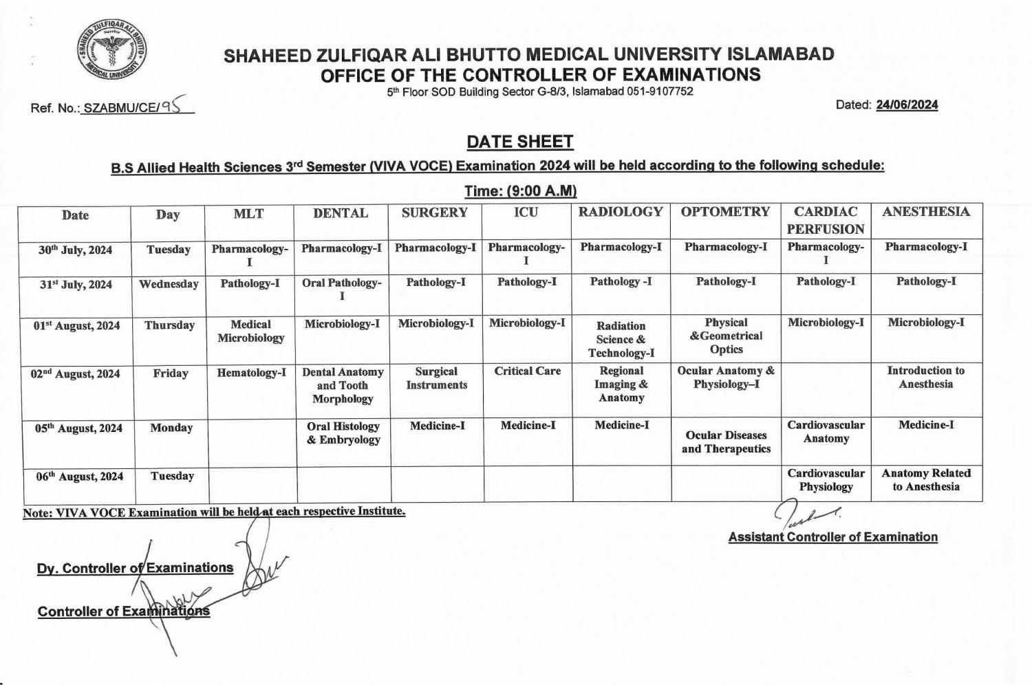 Shaheed Zulfiqar Ali Bhutto Medical University SZABMU has released the date sheet for the BS Allied Health Sciences AHS programs 3rd semester examinations and Viva Voce sessions for 2024. This announcement is pivotal for students preparing for these crucial assessments in their academic journey.