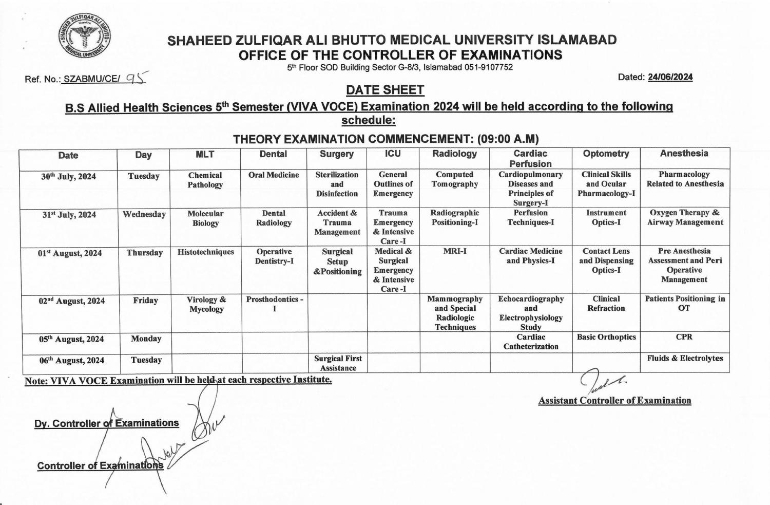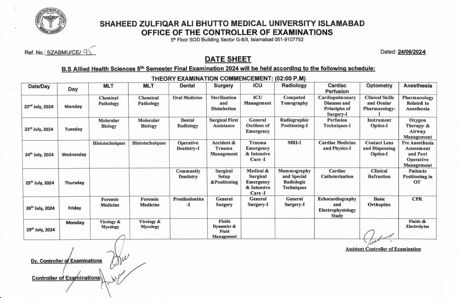 Shaheed Zulfiqar Ali Bhutto Medical University SZABMU has released the SZABMU Date Sheet 2024 for the BS Allied Health Sciences BS AHS program. Students enrolled in the 5th Semester of the BS AHS program can now access their examination schedules.