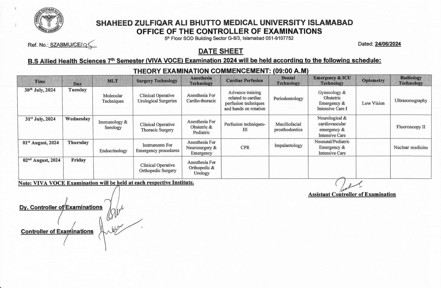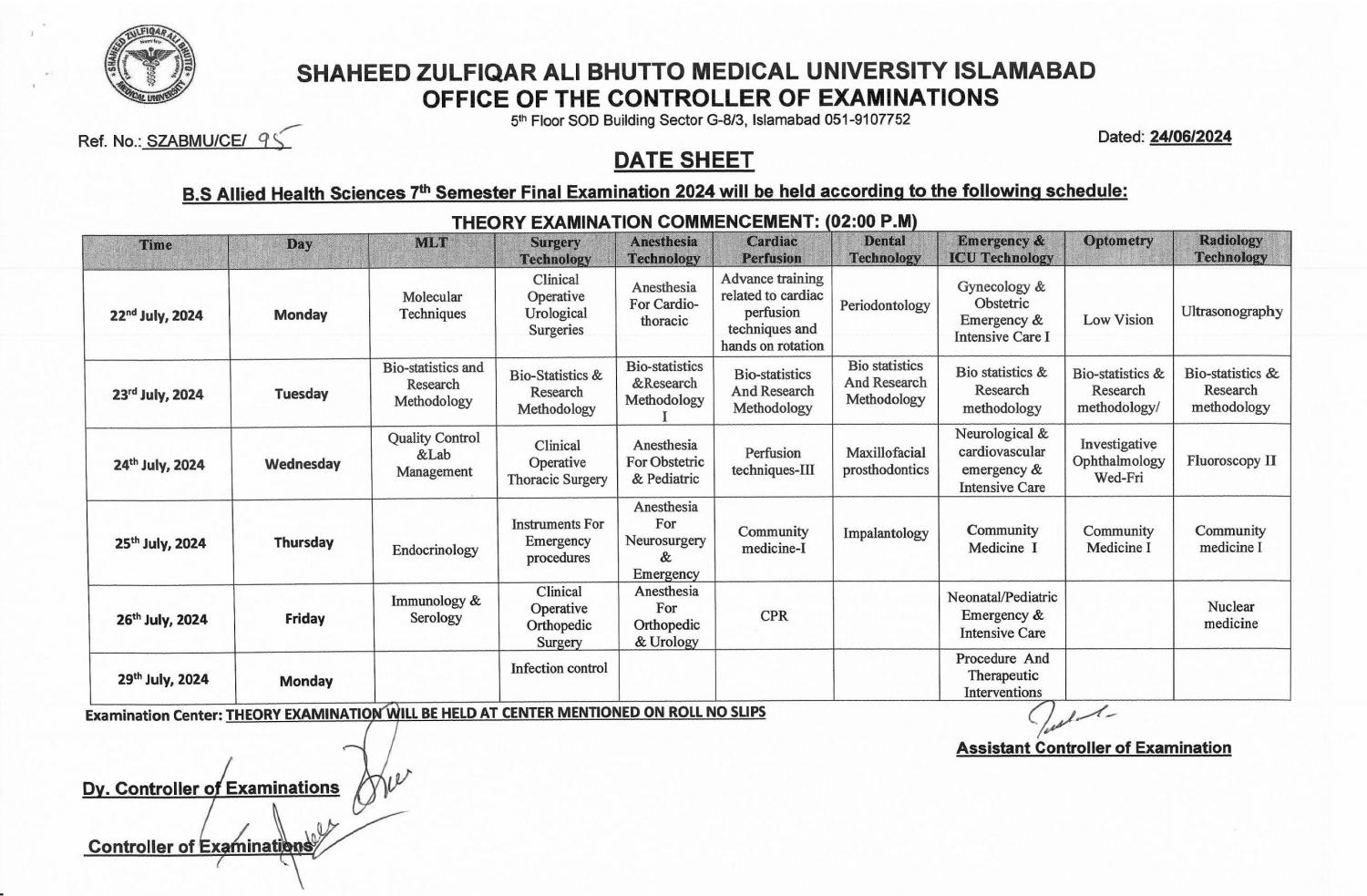 Shaheed Zulfiqar Ali Bhutto Medical University SZABMU has officially released the SZABMU Date Sheet 2024 for the BS Allied Health Sciences BS AHS program. Students in the 7th Semester of the BS AHS program can now view their examination schedules.