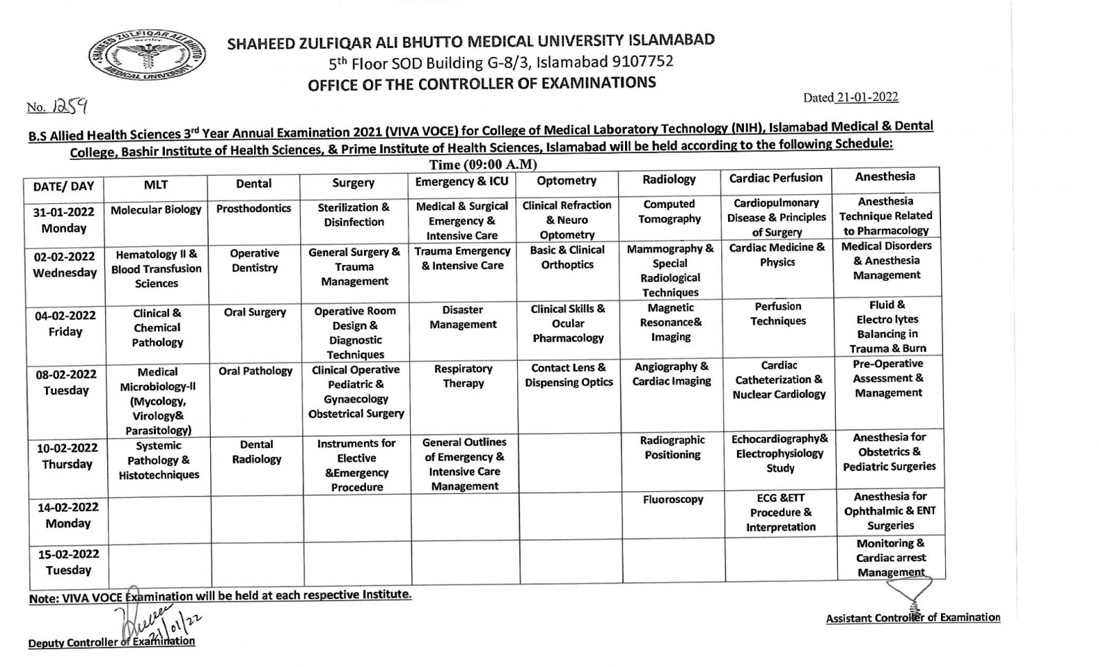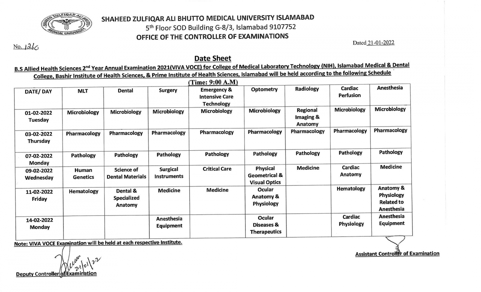 Shaheed Zulfiqar Ali Bhutto Medical University Islamabad Examinations Department has Scheduled BS Allied Health Sciences 2nd & 3rd Year Annual exam 2021. BS AHS Annual Exam 2021 will be initiated according to announced SZABMU BS AHS 2nd Year Annual Exam 2021 Datesheet 2022 in the month of February 2022. SZABMU Examinations Section is intimating to students of BS Allied Health Sciences that SZABMU 2nd Year BS AHS Annual Exam 2021 Date Sheet 2022 and SZABMU 3rd Year BS AHS Annual Exam 2021 Date Sheet 2022 have updated for conduction of Viva Voce Annual Exam 2021. Concerned candidates shall be appeared in BS AHS 2nd Year Examination from February 01, 2022 and BS AHS 3rd Year Exam will be conducted from January 31, 2022. Viva Voce Examination will be held at each respective institute at 09:00 am. All the students are advised to bring their own hand sanitizer and mask, without these entry to the examination center will not be permitted. Without University ID Cards students will be not be allowed to sit in the examination and no late comer should be allowed to sit in the Exam.