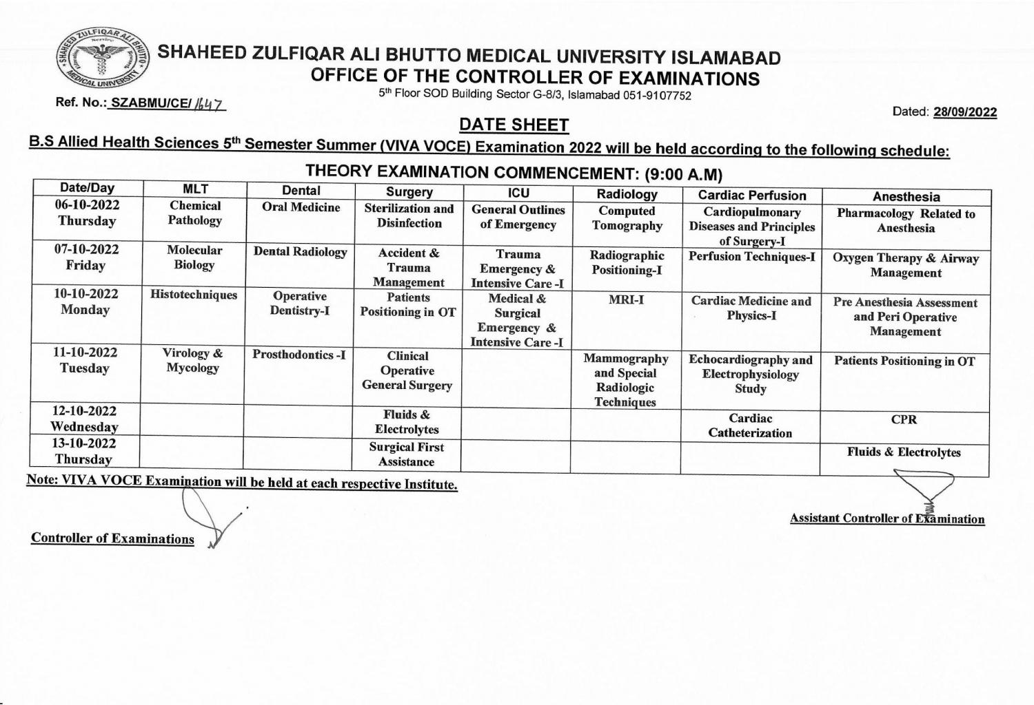 The candidates for the BS Allied Health Sciences Viva Examination 2022 from the Shaheed Zulfiqar Ali Bhutto Medical University are hereby informed that their examinations will be held as per schedule released by university administration, according to a notification released by the Controller of Examinations SZABMU, here on 28th of September 2022 the examination for BS Allied Health Sciences Viva Examination 2022 shall start from 6th of October 2022 for multiple departments. VIVA Voce Examination will be held at each respective institute.