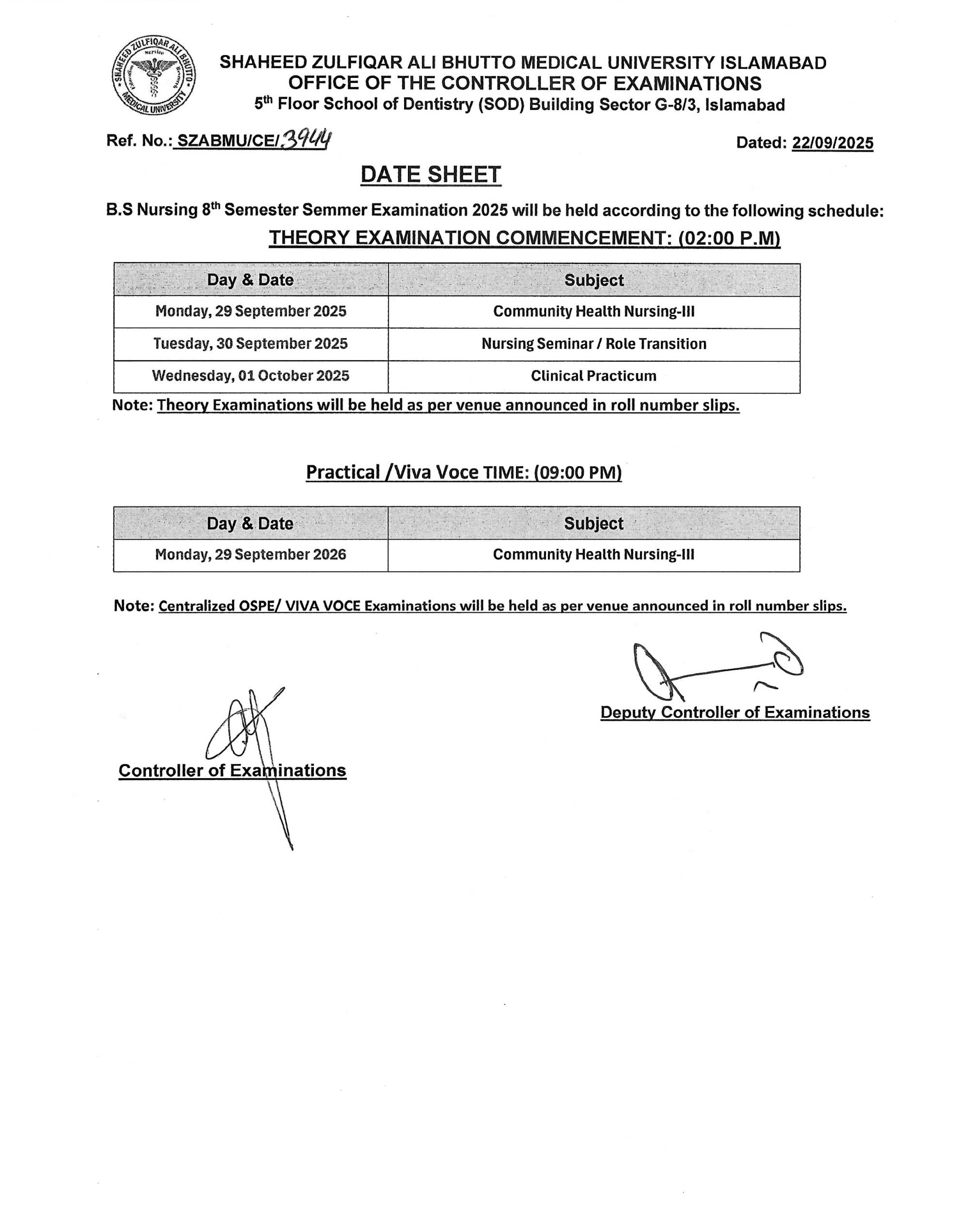 Stay updated with official notifications from Shaheed Zulfiqar Ali Bhutto Medical University regarding the examinations. Good luck to all students appearing in the BS Nursing 8th Semester Summer Examination 2025!