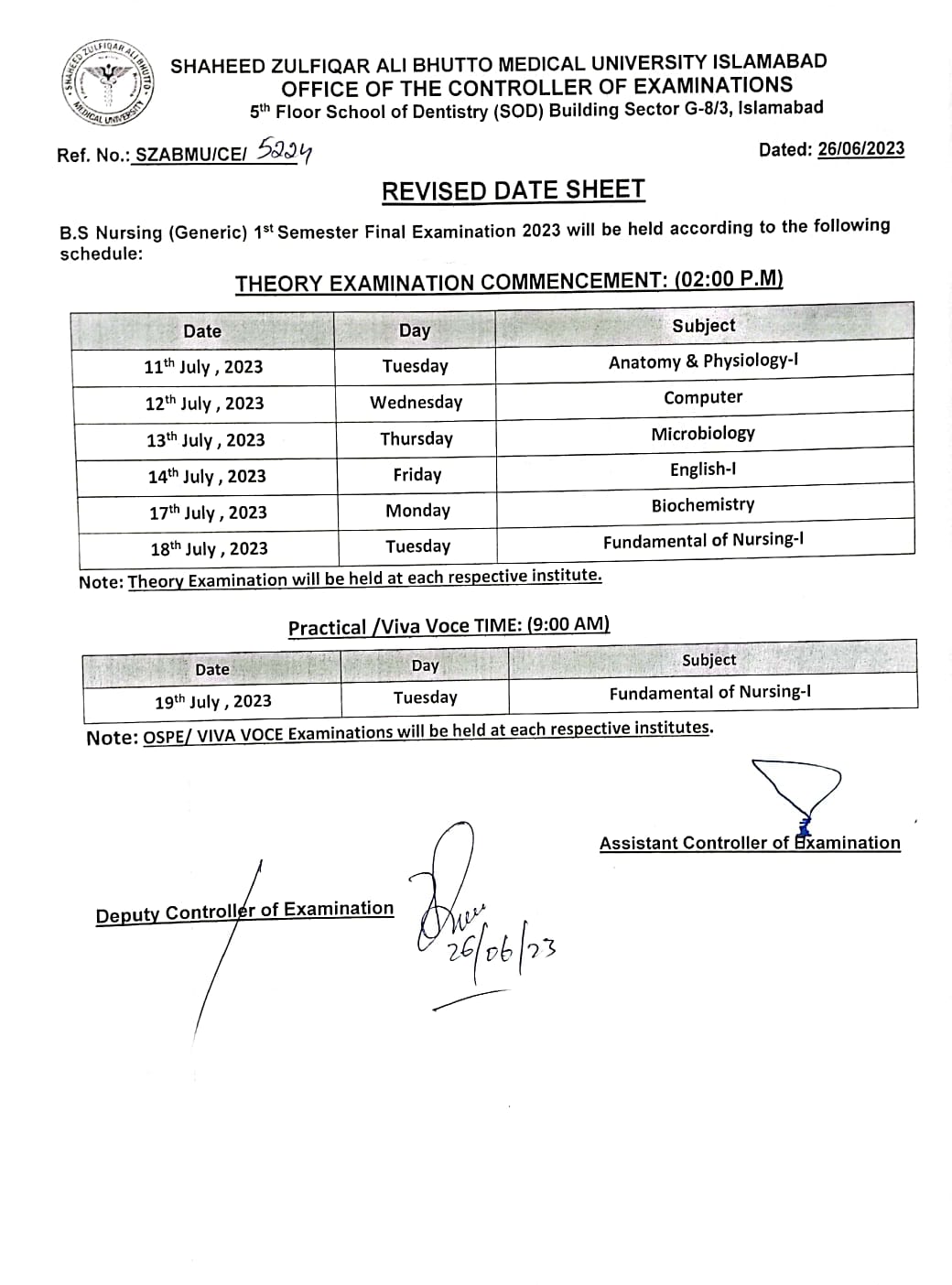 Shaheed Zulfiqar Ali Bhutto Medical University has released the revised date sheet for the SZABMU BS Nursing Generic 1st Semester Final term Theory Exam 2023. The exam will commence on 11th July 2023 and conclude on 19th July 2023. Students are advised to review the updated schedule carefully to ensure they are prepared for their examinations. This revised date sheet 2023 provides a clear timeline for the theory exams, allowing students to plan and organize their study routines accordingly. It is essential for students to adhere to the exam dates and be present at the designated venues on time. By following the SZABMU revised date sheet 2023, students can approach their exams with confidence and achieve their academic goals.