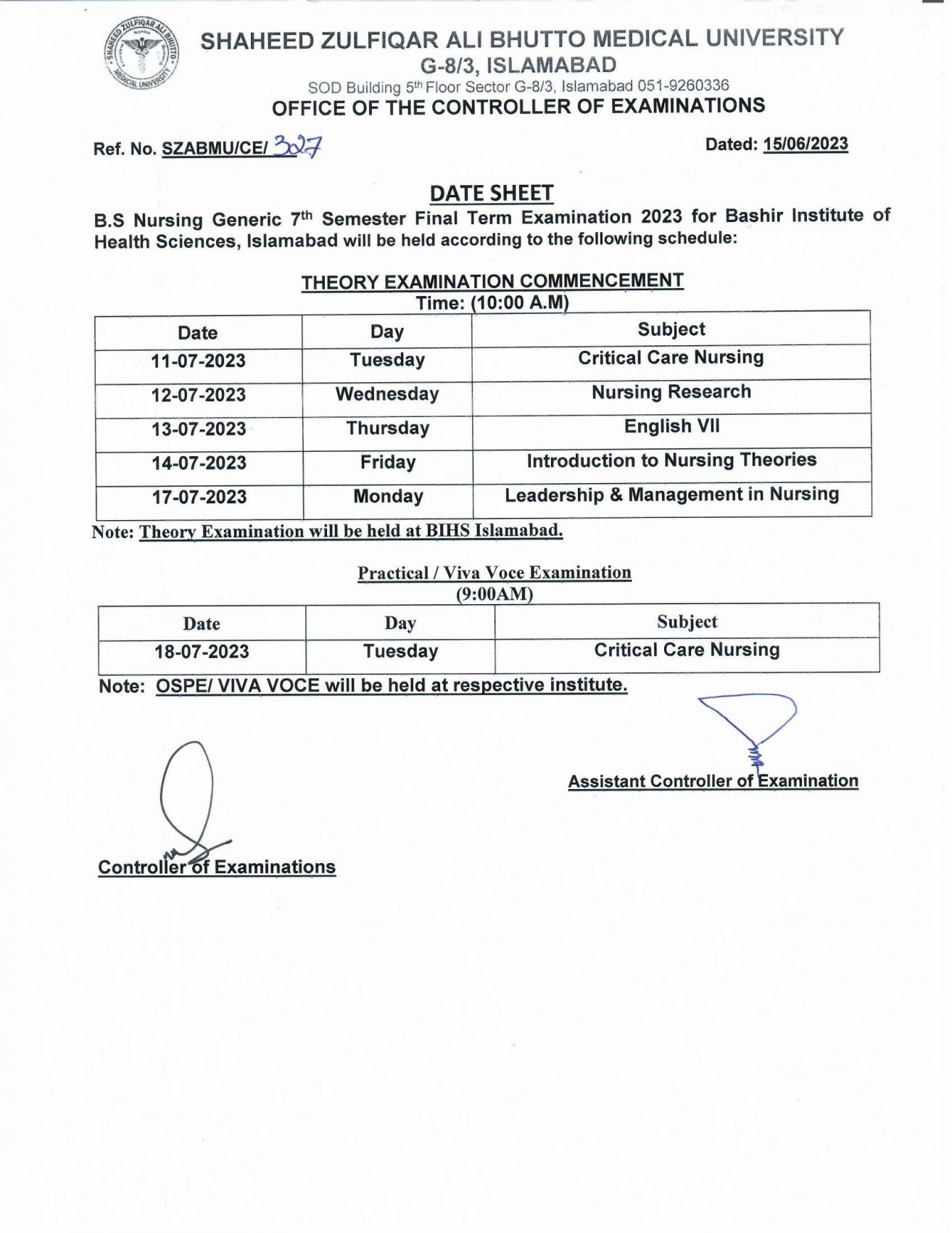 Shaheed Zulfiqar Ali Bhutto Medical University has released the date sheet for the SZABMU BS Nursing Generic 7th Semester Final Term Exam 2023. The exam is scheduled to commence on 7th July 2023 and will conclude on 17th July 2023. This announcement brings anticipation and nervousness among the nursing students as they prepare to showcase their knowledge and skills in this crucial examination. The date sheet 2023 serves as a roadmap for the students, helping them plan their study schedule and revision strategies effectively. It outlines the dates and timings of each subject, allowing students to allocate their time accordingly. As the SZABMU final term exam 2023 approaches, students are encouraged to utilize their time wisely, revise thoroughly, and seek clarification on any doubts or concepts. The SZABMU wishes all the nursing students the best of luck in their exams and hopes for their success in this significant milestone of their academic journey.