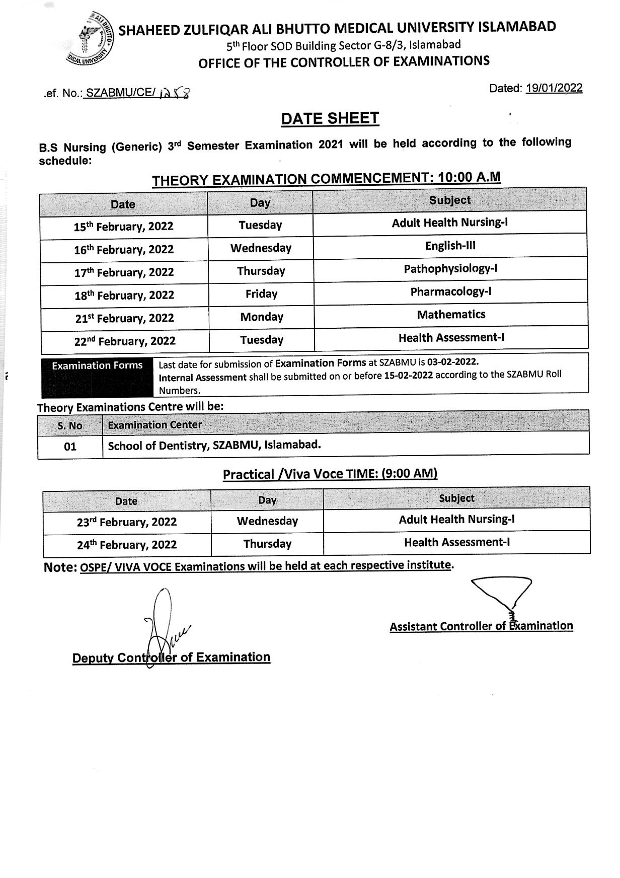 Shaheed Zulfiqar Ali Bhutto Medical University Islamabad is intended to initiate the BS Nursing Generic 3rd Semester Theory Examination 2021. For initiating the exam SZABMU is providing SZABMU BS Nursing Generic Exam 2021 Date Sheet 2022 to concerned students for appearing in exam. BS Nursing 3rs Semester Examination 2021 is going to be held as per announced SZABMU BS Nursing Exam 2021 Date Sheet 2022 in the month of February. Students shall attend their Theory Examination according to mentioned Date, Day and Time in allotted venue from February 15, 2022 while Practical Examination will be started from February 23, 2022. It is informed to students submit their Examination Admission Forms with single fee till March 03, 2022. Candidates must bring their necessary stuff in Examinations hall regarding Examinations. All COVID-19 SOPs issued by Government should be strictly observed.