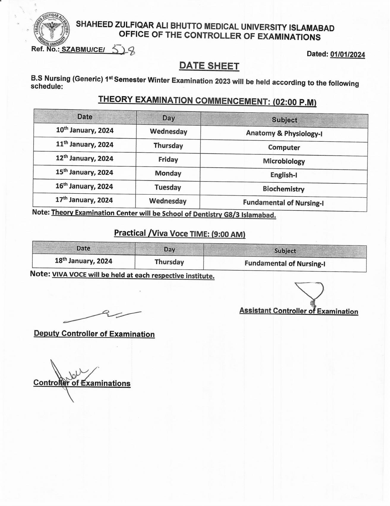 In a noteworthy development for students pursuing a Bachelor of Science in Nursing Generic at Shaheed Zulfiqar Ali Bhutto Medical University SZABMU in Islamabad, the Office of the Controller of Examinations has released the date sheet for the upcoming 1st Semester Winter Examination 2023.