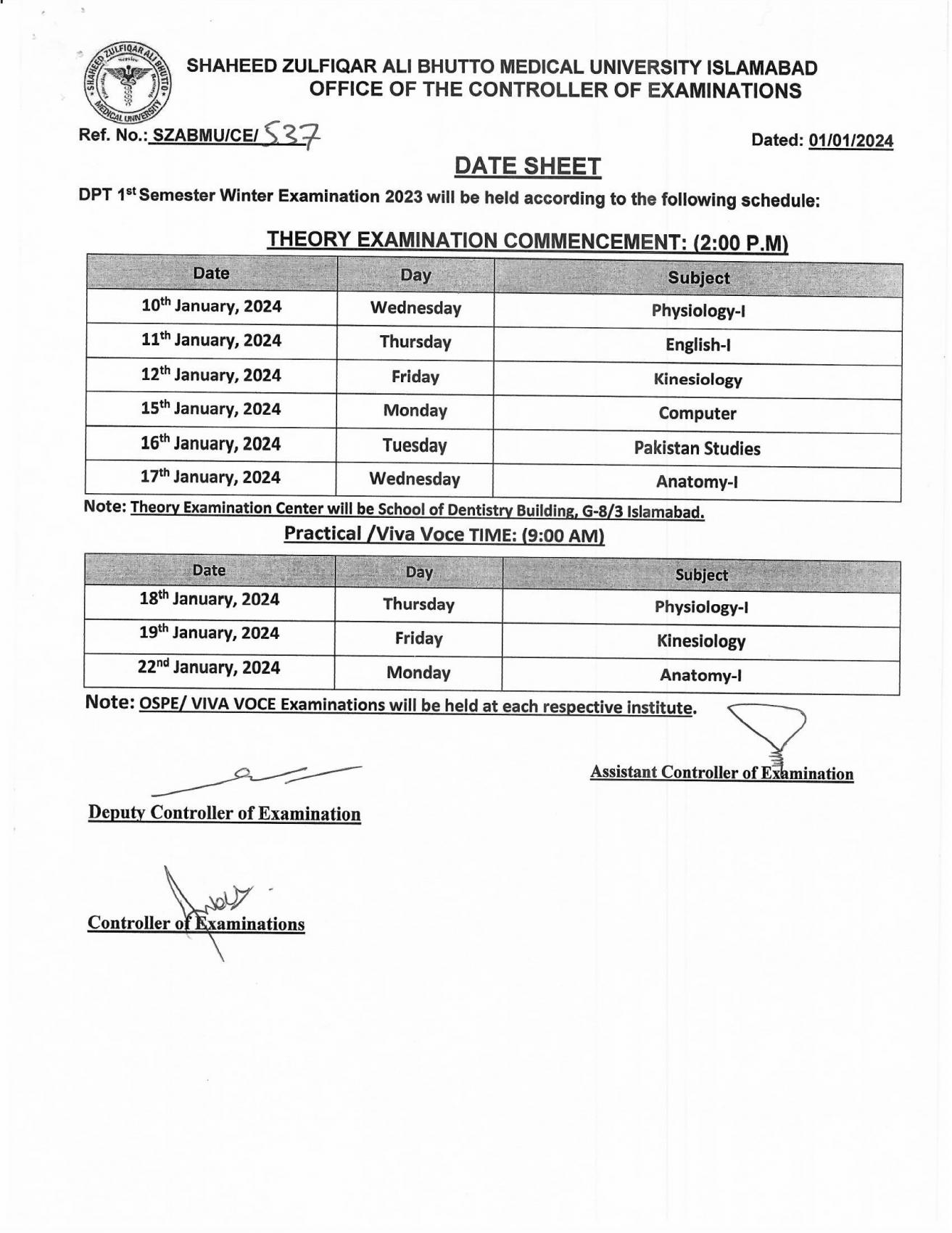 In a significant development for students pursuing the Doctor of Physical Therapy DPT program at Shaheed Zulfiqar Ali Bhutto Medical University SZABMU in Islamabad, the Office of the Controller of Examinations has released the date sheet for the upcoming 3rd Semester Winter Examination 2023.