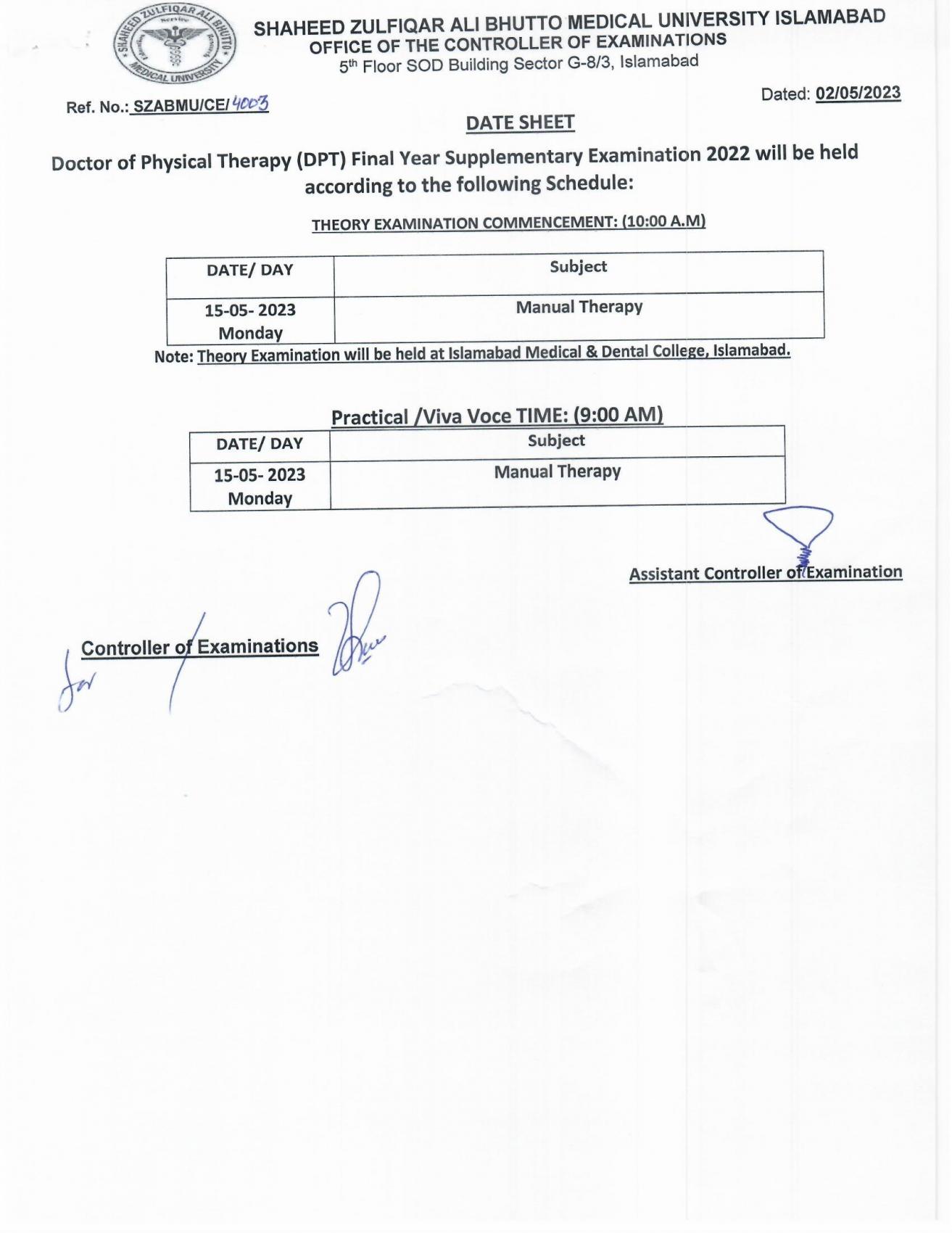 SZABMU DPT Final Year Supply Exam 2023 Date Sheet