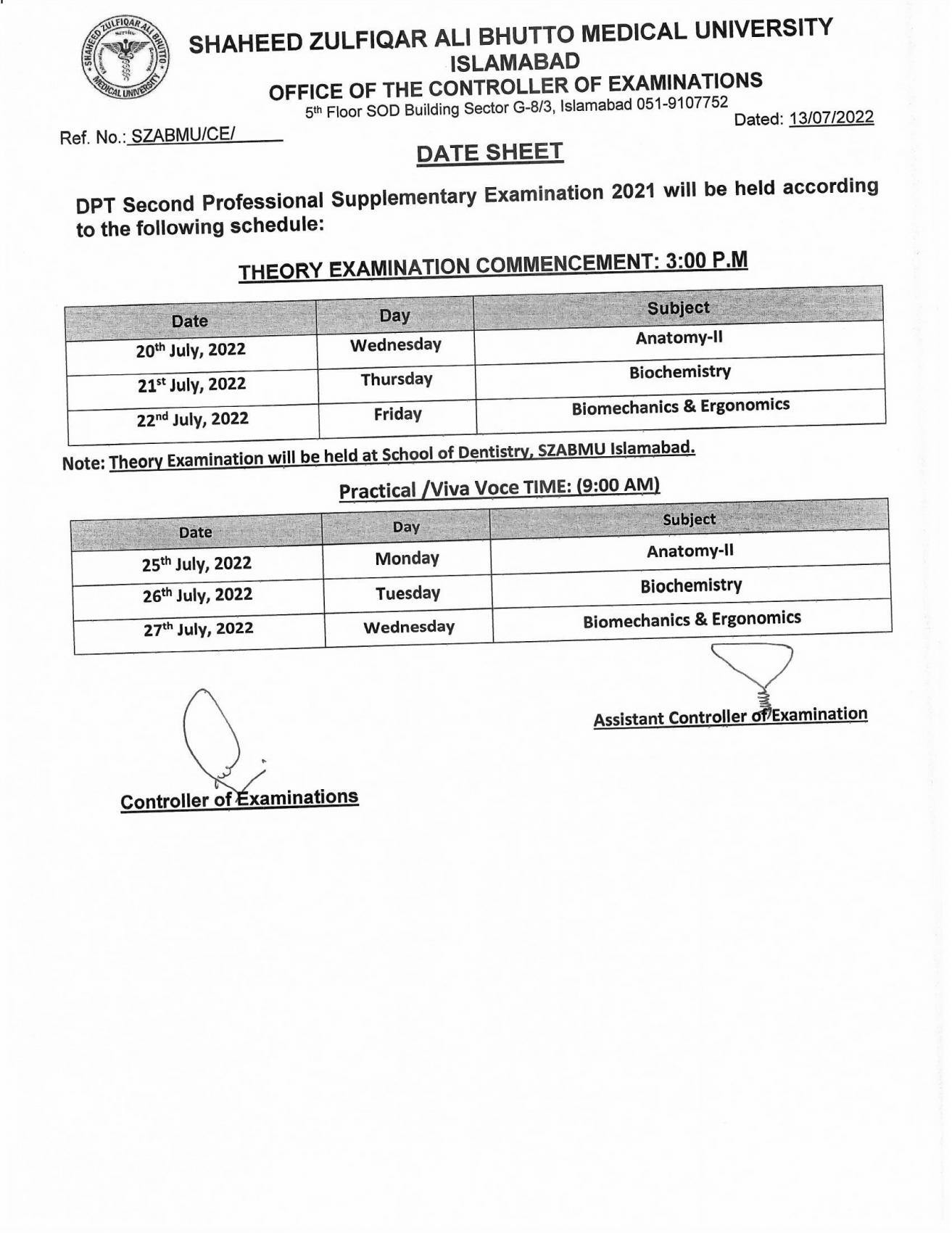 Shaheed Zulfiqar Ali Bhutto Medical University Islamabad Examinations Authority is arranging the SZABMU Islamabad DPT Second Prof Supply Examination 2022. To adjust the DPT Second Professional Supplementary Examination 2021 SZABMU has announced SZABMU DPT Second Prof Supply Exam 2021 Schedule 2022 for the students who are enrolled in DPT Second Professional Supplementary Examination 2021. SZABMU is intimating to the DPT Students that their Supplementary Examination 2021 will be held from July 20, 2022. The candidates appearing in BS Dental Technology Exams shall follow the released SZABMU DPT Supply Exam 2021 Schedule 2022 and appear in their relevant subject. To avoid any delay in conduct of paper, students shall reach the examination hall 15 minutes before the due timing. Without University ID Cards students will be not be allowed to sit in the examination and no late comer should be allowed to sit in the Exams.
