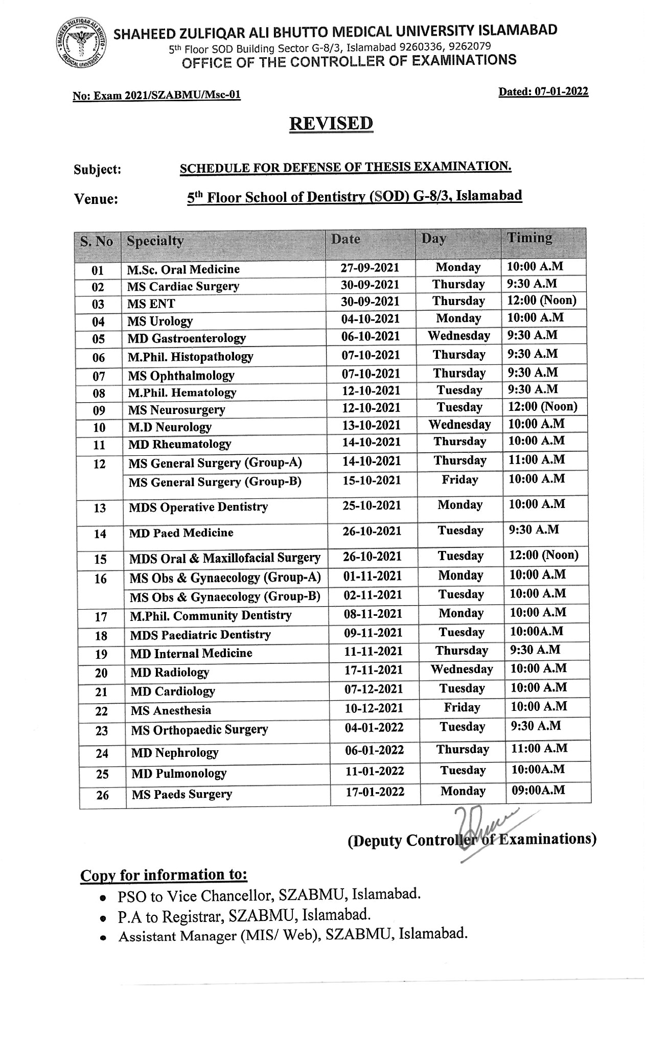 SZABMU Isb MPhil MSc MDS MS Defense of Thesis Exam Schedule