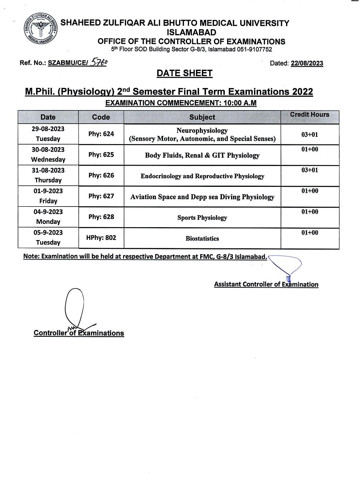 SZABMU Islamabad M Phil Physiology Final Exams Date Sheet 2023
