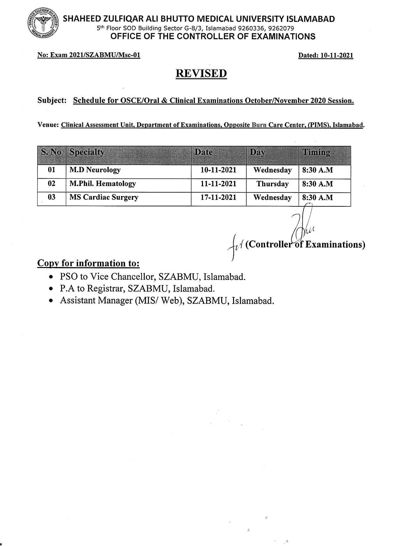 Shaheed Zulfiqar Ali Bhutto Medical University Islamabad is arranging the OSCE/Oral and Clinical Examinations Session 2020 of the students who are enrolled in MD Neurology, MPhil Hematology, MS Cardiac Surgery. SZABMU announced Revised Date Sheet. In this Regard, SZABMU Islamabad has announced Examinations Schedule for MD Neurology, MPhil Hematology, MS Cardiac Surgery Examinations 2020. According to schedule Clinical Examinations 2020 are going to be started from November 10, 2021. Paper will be started in first shift at 08:30 AM. Examination will be held in the Department of Clinical Assessment Unit Department of Examinations PIMS Islamabad. Students are advised to check the Notice Board/University Website/LMS Notifications regularly for any change.
