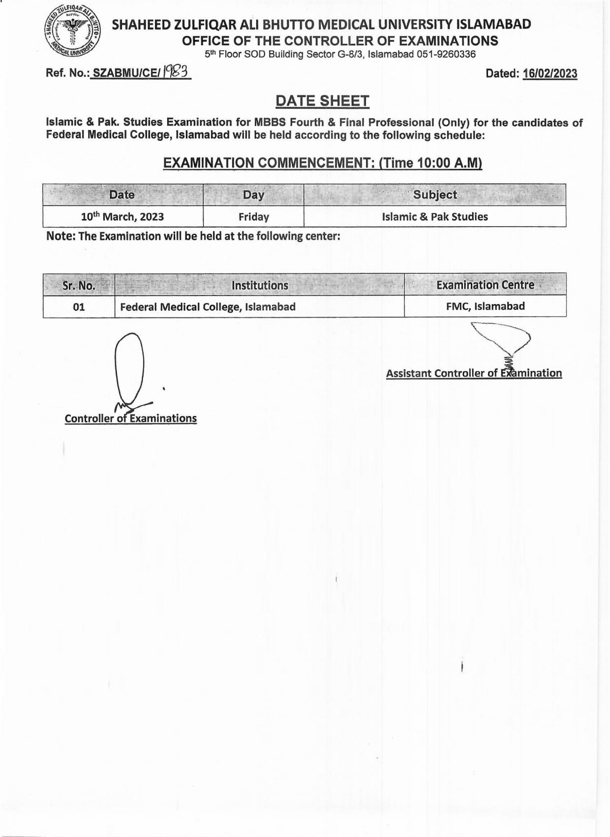 Shaheed Zulfiqar Ali Bhutto Medical University has already receive admission form from the student to manage MBBS 4th and Final Professional Subject Islamic and Pak Studies Exam 2023. The exam section of SZABMU has announced to take MBBS 4th and Final Professional Subject Islamic and Pak Studies Exam 2023. The students who want to appear in their MBBS 4th and Final Professional Subject Islamic and Pak Studies Exam 2023 can now note their MBBS 4th and Final Professional Subject Islamic and Pak Studies Exam 2023 Date Sheet, which is mentioned online and students can follow them at the time of appearing in their exams. According to SZABMU Exam 2023 will be Held on March 10, 2023 and will be held according to the schedule. Student can download date sheet from University official web site.