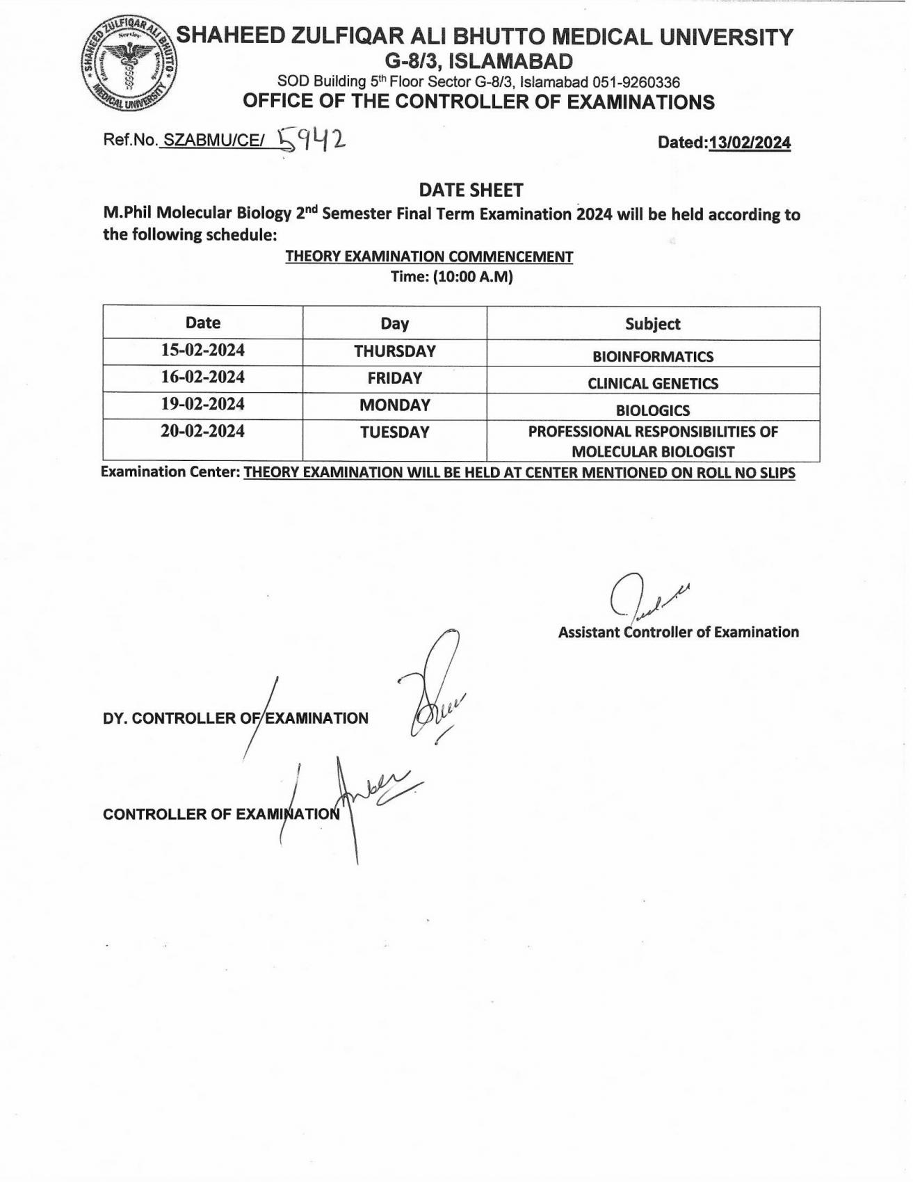 SZABMU MPhil Molecular Biology Final Exams Date Sheet 2024