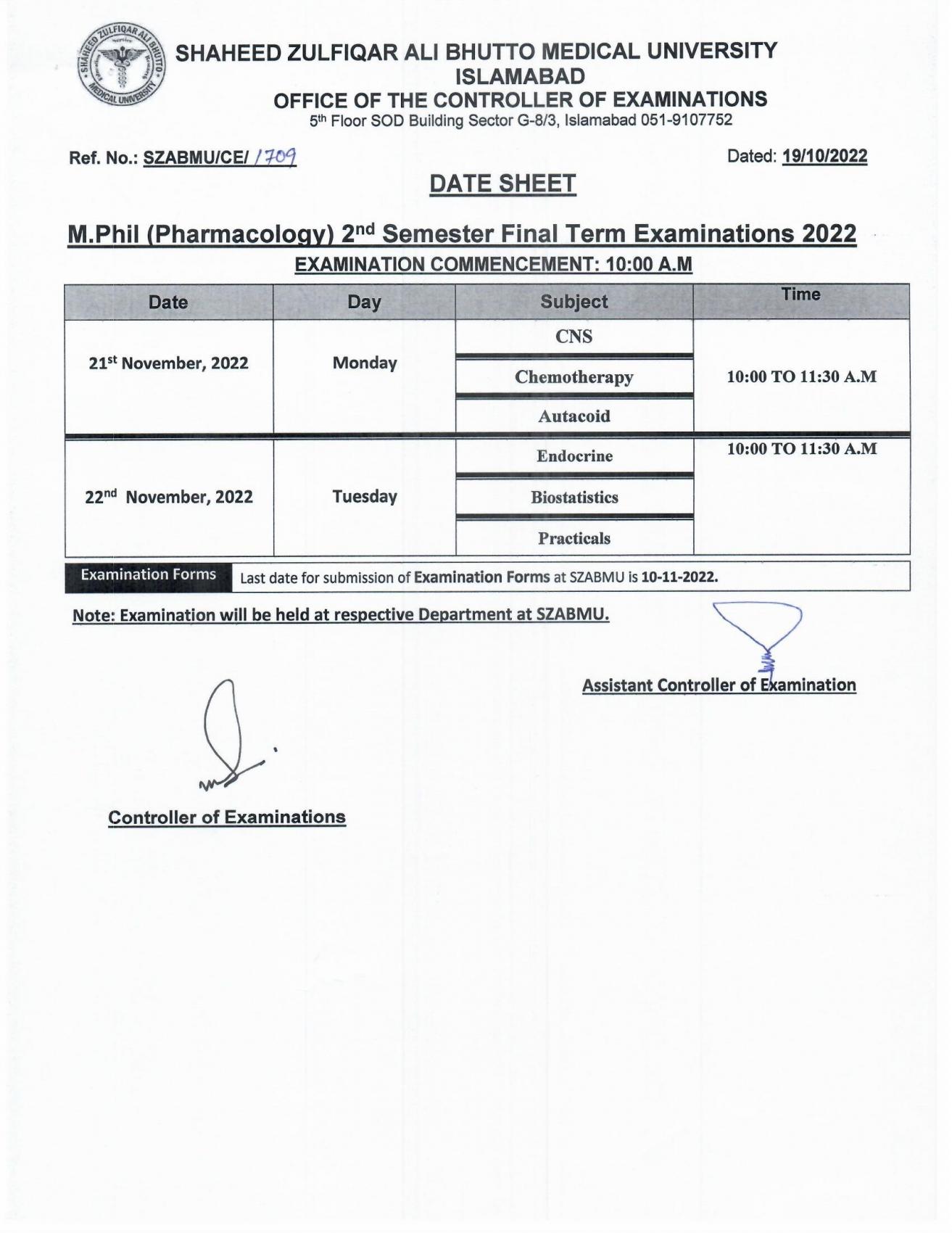 SZABMU MPhil Pharmacology Exam Schedule 2022