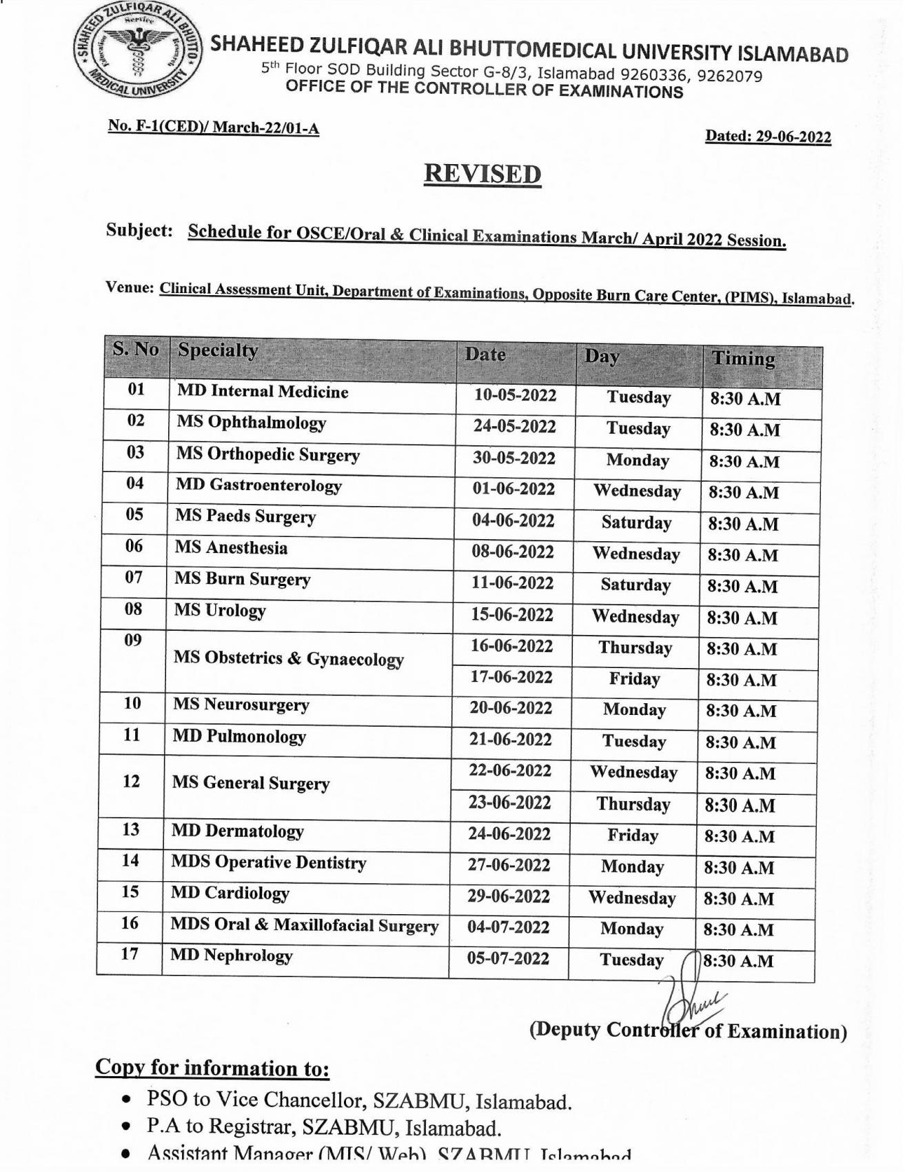 Shaheed Zulfiqar Ali Bhutto Medical University Islamabad has issued the SZABMU MS MD MDS Exams 2022 Revised Date Sheet for OSCE / Oral & Clinical Examinations 2022. Now, MD, MS, MDS students shall be physically attend their SZABMU MS, MD, MDS OSCE / Oral and Clinical Examinations 2022 as SZABMU provided the SZABMU MS MDS MDS Exam Revised Date Sheet 2022. Students are required to appear in exams by following the SZABMU MS MD MDS OSCE & Clinical Exams Revised Datesheet 2022 according to their respective subject as mentioned in date sheet. Students shall check their SZABMU Islamabad MD MDS MDS Exam Revised Schedule 2022 carefully and attempt their exam according to the their respective subject. Exam commencement timings is 08:30 am. Students are advised to follow the examination instructions issued by the SZABMU to avoid any inconvenience in their OSCE / Clinical Exams 2022.