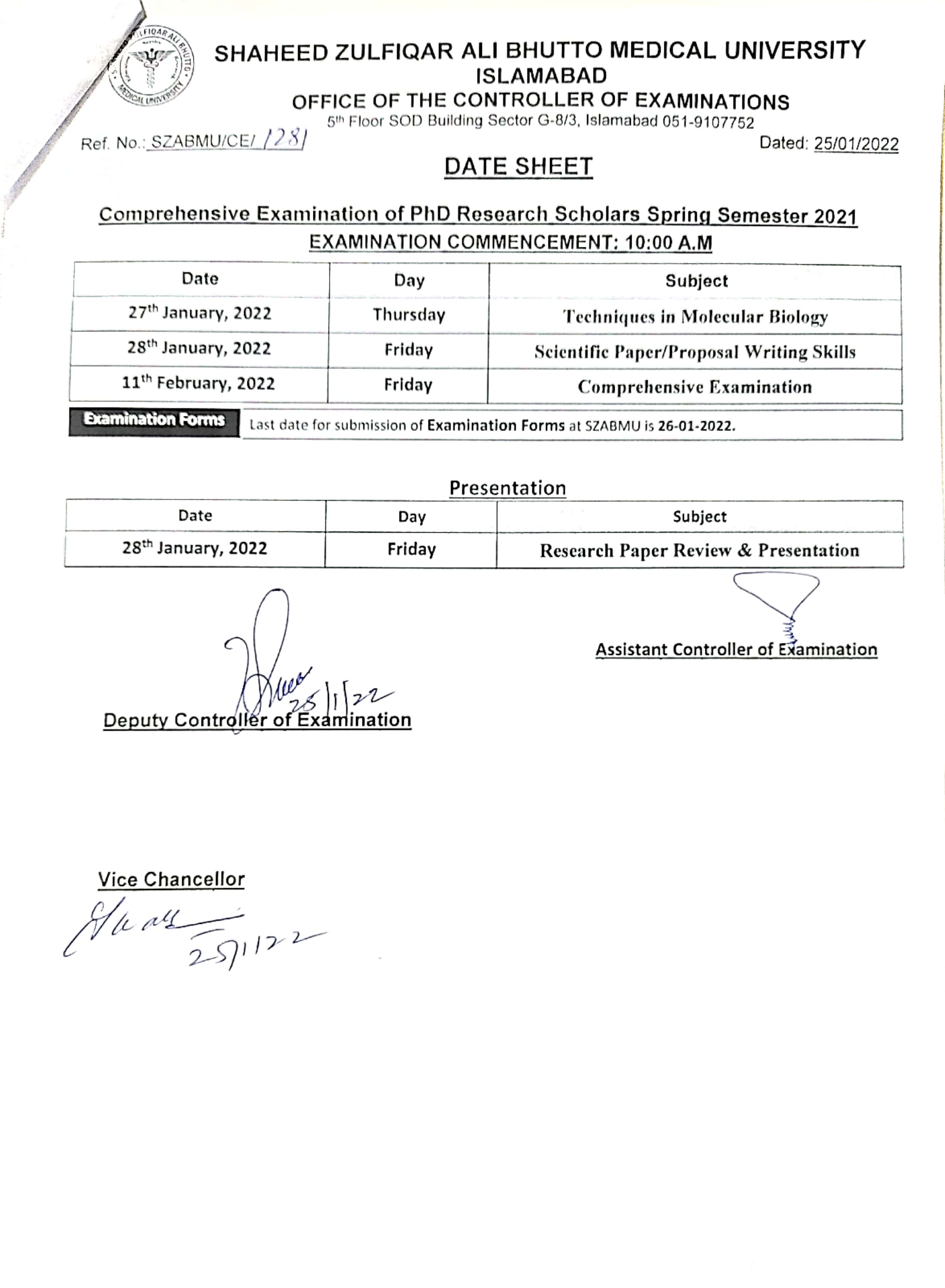Shaheed Zulfiqar Ali Bhutto Medical University Islamabad is going to hold the PhD Research Scholars Spring Semester 2021 Exam. PhD Exam has been scheduled to conduct as per announced SZABMU PhD Research Scholars Spring Exam 2021 Schedule 2022. SZABMU has announced SZABMU PhD Research Scholars Exam 2021 Date Sheet 2022 for conduction of Examination. SZABMU is intimating to concerned candidates who are preparing to appear in PhD Exam that their Examination is Commencing in the month of January. Candidates shall start implementation on SZABMU PhD Research Scholars Spring Semester Exam 2021 Schedule 2022 from January 27, 2022. Exam commencement Time is 10:00 am. All the students are advised to bring their own hand sanitizer and mask, without these entry to the examination center will not be permitted. Course exam mentioned in this Date Sheet will be held as per the date and time mentioned in the Date Sheet.
