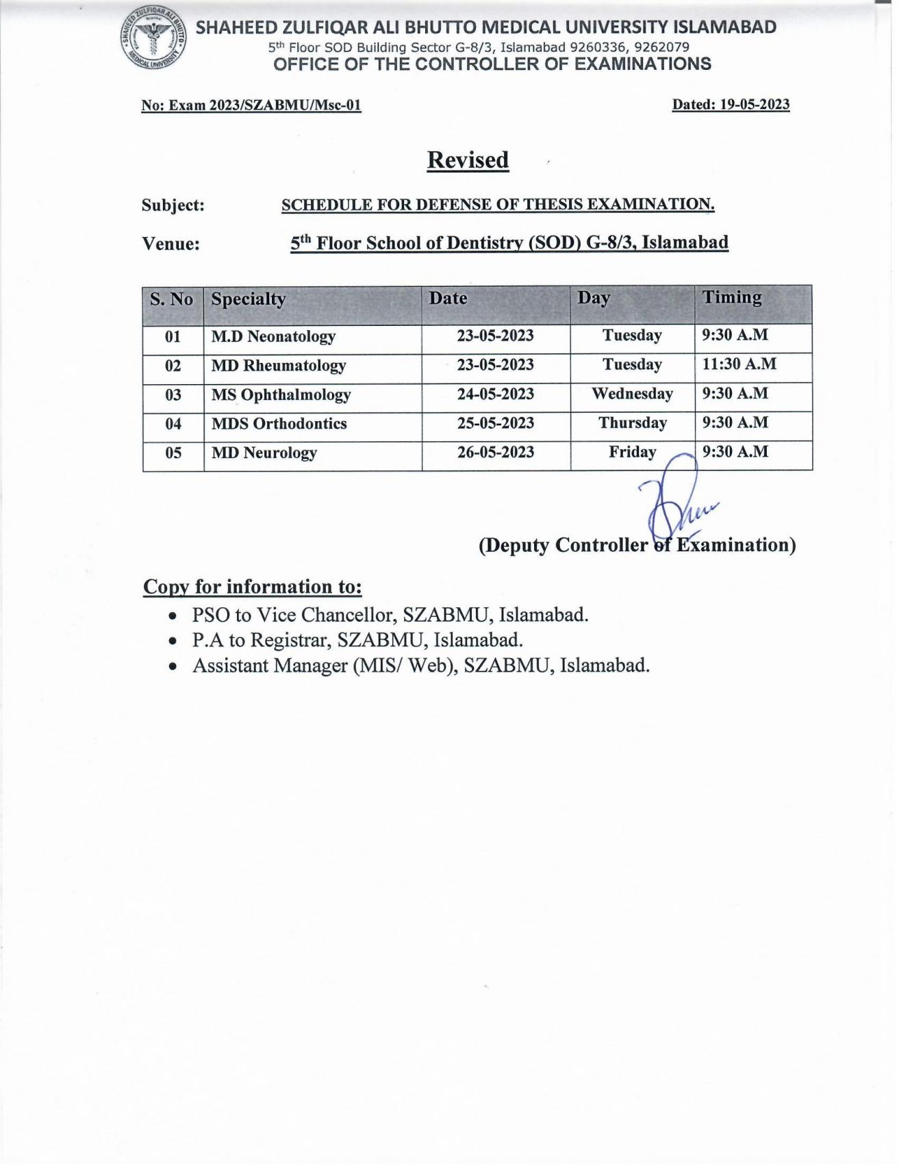Shaheed Zulfiqar Ali Bhutto Medical University is pleased to announce the schedule for the SZABMU Defence of Thesis Exam 2023. The highly anticipated examination will commence on 23rd May 2023 and conclude on 26th May 2023. This significant event marks a crucial milestone for the aspiring medical students at the university.
