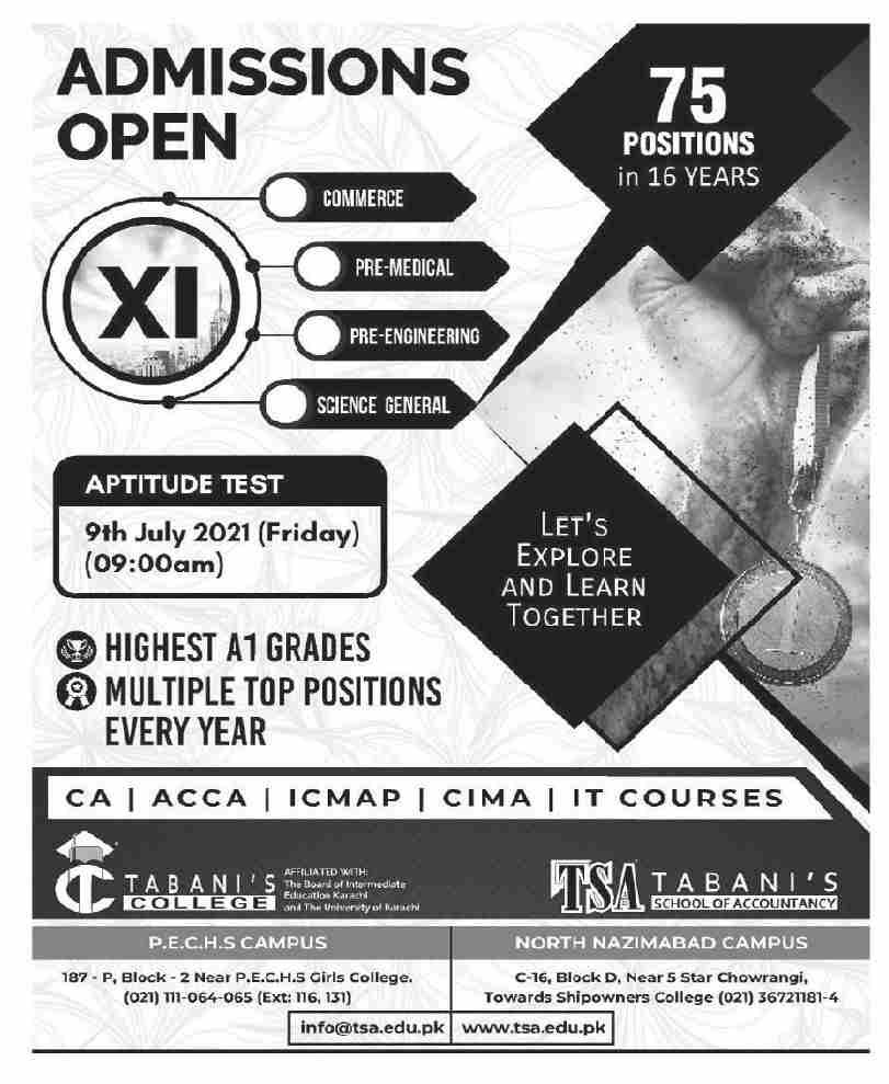 Tabanis College Karachi is intended to open Admissions of Intermediate in commerce, Pre-Medical, Pre-Engineering, General Science and various programmes in CA, ACCA, ICMAP, COMA, IT Courses. Aptitudes Test will be conducted on July 09, 2021. Admissions are open for Academic session 2021.