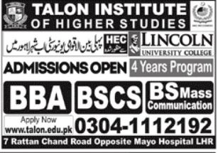 Talon Institute of Higher Studies Lahore, Affiliated with Lincoln University College LUC Malaysia, Recognized with HEC, is accepting applications from desirous candidates for granting Talon Institute Lahore Undergraduate Admissions 2022 for 4 Years. Talon Institute Lahore BS Admissions 2022 are announced in Mass Communication, Computer Science, Talon Institute Lahore BBA Admissions 2022 are also offered. Scholarships will be awarded to Needy and Talented Students. The las date for submission of Scholarship Forms is January 18, 2022. Interviews will be held on January 20, 2022. Admissions are open for Session 2022.