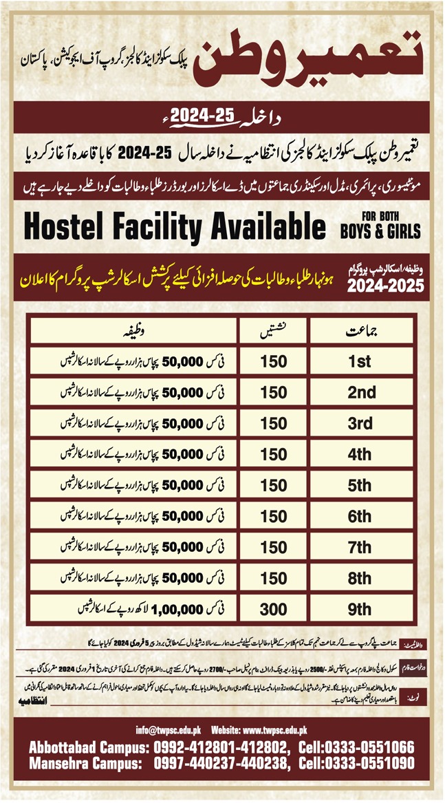 The Tameer I Wattan Schools and Colleges Group of Education in Pakistan has officially commenced its admission process for the academic year 2024-25. With a commitment to providing quality education and fostering talent, the institution announces various scholarship programs and facilities for both boys and girls, including hostel accommodations.