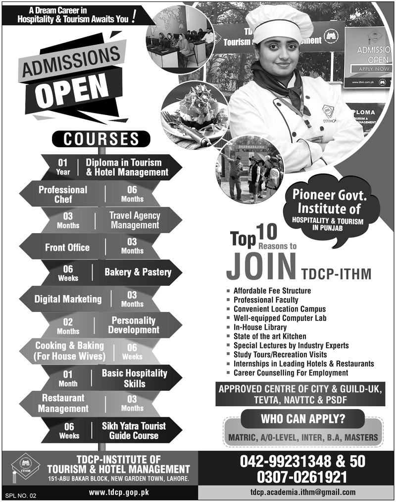 in the Diploma in Tourism & Hotel Management , Professional Chef, Tracel Agency management, Front Office, Bakery & Pastery, digital marketing, Personality Development, Cooking & Baking, Basic Hospitality Skills, Restaurant Management, Sikh Yatra Tourist Guide Course.