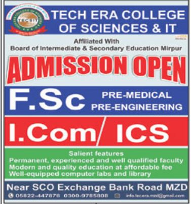 Tech Era College of Sciences & IT Muzaffarabad has announced admissions for FSc Pre-Engineering, Pre-Medical, I.Com, ICS. Well-equipped Computer lab and Library.