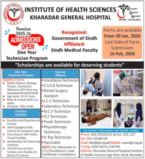The Institute of Health Sciences, Kharadar General Hospital has officially announced its IHS KGH Admissions 2026 for the session 2025-26. Recognized by the Government of Sindh and affiliated with the Sindh Medical Faculty, the institute is opening doors for students to specialize in various essential healthcare technical roles.