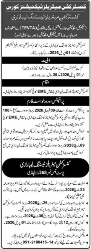 The Construction Materials Testing Laboratory has officially announced its upcoming technical training program, marking a significant opportunity for students pursuing vocational excellence. Affiliated with the Punjab Board of Technical Education, Lahore, and approved by the Technical Education and Vocational Training Authority TEVTA, the Construction Materials Testing Laboratory is set to begin its new session on April 1, 2026.