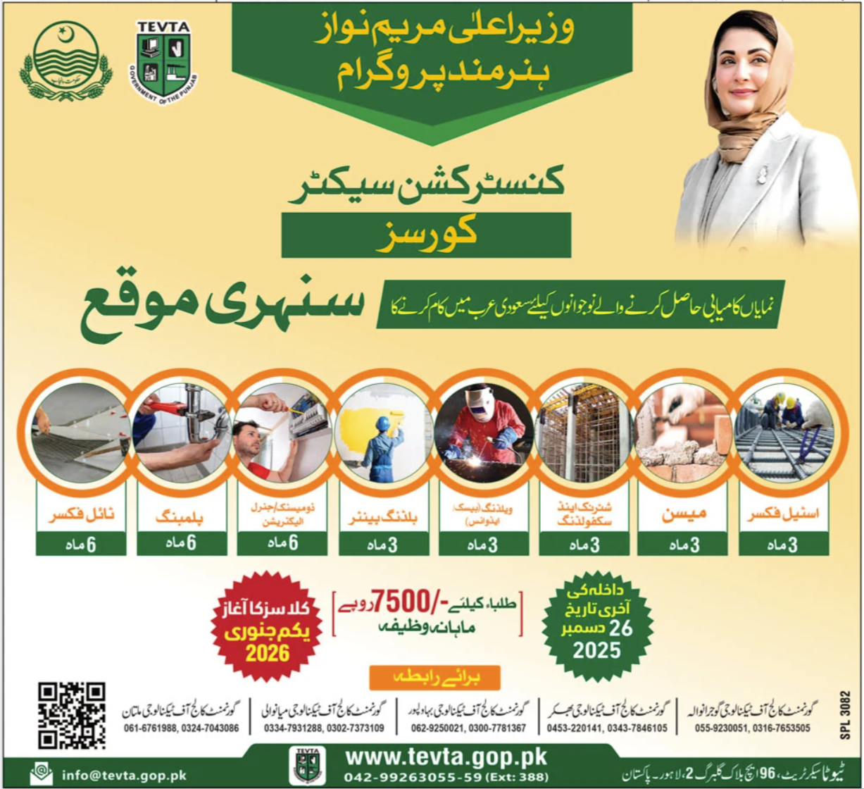 TEVTA Technical Education & Vocational Training Authority, Punjab offers a valuable opportunity for young individuals to gain professional skills in the construction sector. This initiative aims to prepare skilled manpower for international employment, especially in Saudi Arabia, opening doors to a brighter and secure future.