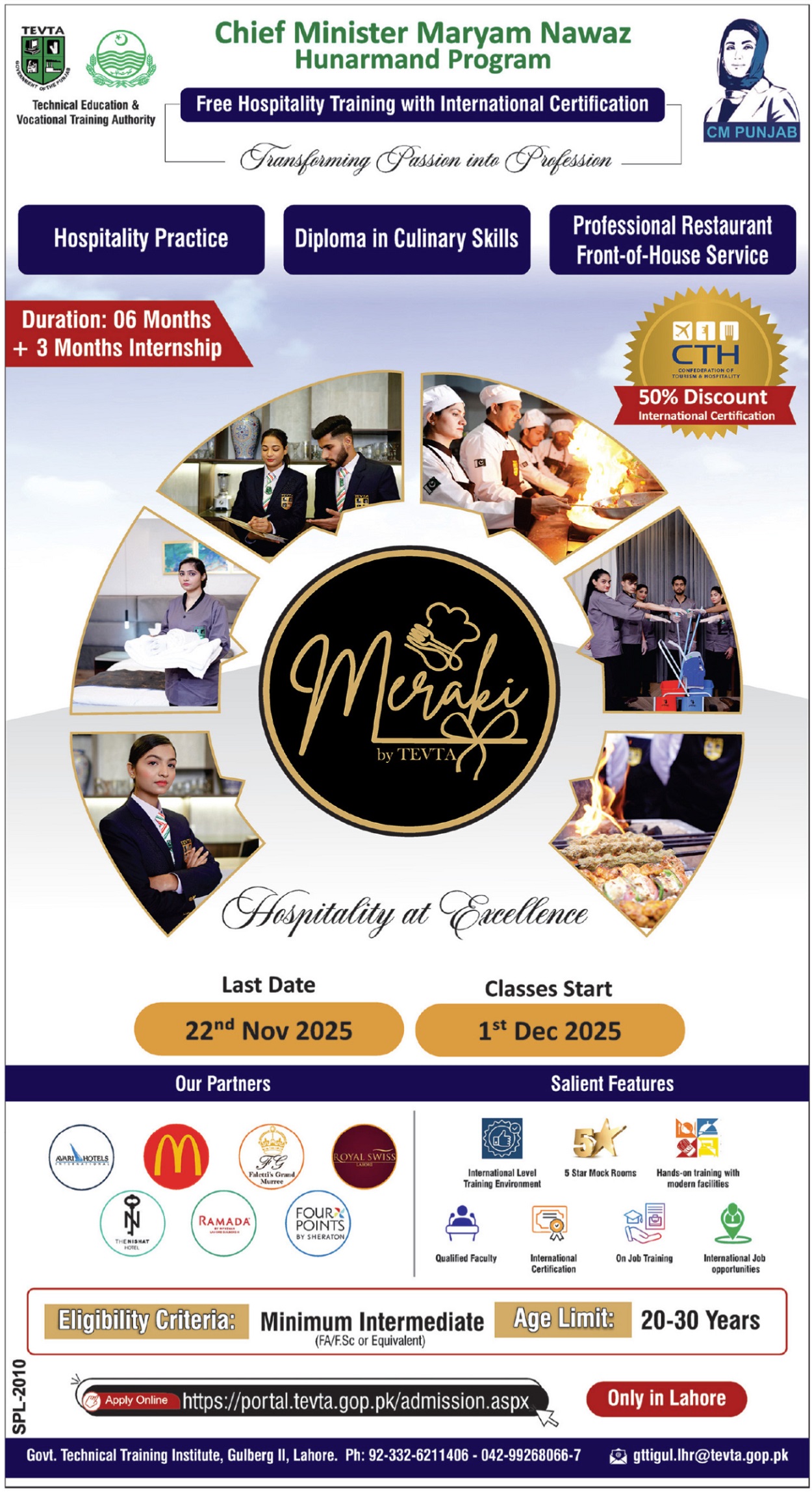 The Technical Education & Vocational Training Authority TEVTA, Punjab, under the Chief Minister Maryam Nawaz Hunarmand Program, is offering free professional hospitality training to transform your passion into a rewarding career.