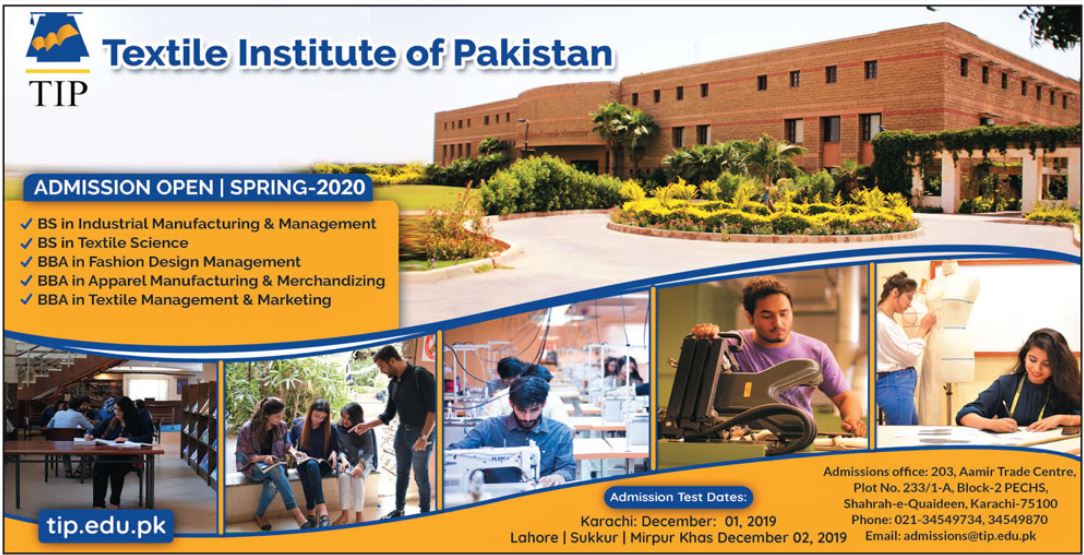 Textile Institute of Pakistan Lahore has announced admissions for BS in Industrial Manufacturing & Management, Textile Science, BBA in Fashion Design Management, Textile Management & Marketing, Apparel Manufacturing & Merchandising.