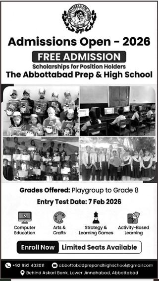The Abbottabad Prep & High School is pleased to announce that admissions for the academic year 2026 are now open. Known for its commitment to quality education and holistic child development, the school offers a nurturing and stimulating learning environment for young learners.
