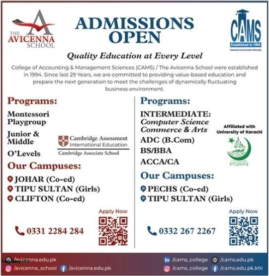 The Avicenna School is delighted to announce admissions for the year 2023. With a wide range of admission 2023 classes available, including Playgroup, Junior and Middle levels, O Level, Intermediate in Computer Sciences, Commerce, and Arts, as well as BS, BBA, and ACCA programs, students can explore diverse educational pathways. The school prides itself on providing a holistic learning environment that fosters academic excellence, character development, and critical thinking skills. With highly qualified faculty, state-of-the-art facilities, and a commitment to nurturing individual talents, The Avicenna School offers a comprehensive educational experience. Dont miss the opportunity to join a community that values innovation, diversity, and lifelong learning. Enroll today to embark on a journey of knowledge and personal growth at The Avicenna School.