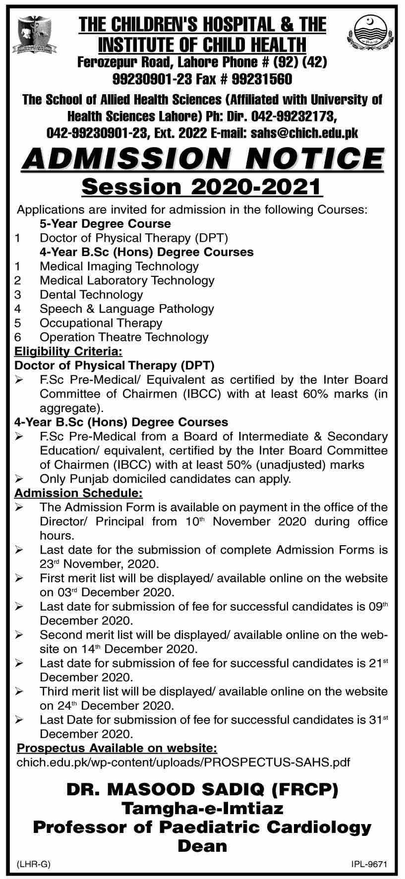 The Institute of Child Health has announced the new admissions for Doctor of Physical Therapy DPT, BSc Hons in Medical Imaging Technology, Medical Laboratory Technology, Dental Technology, Speech & Language Pathology, Occupational Therapy, Operation Theatre Technology in Lahore. Last date for submissions of application are 23 November 2020.