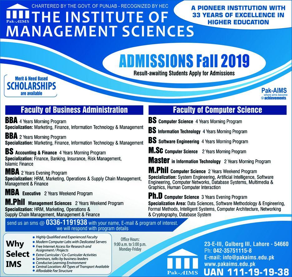 The Institute of Management Sciences Admissions fall 2019 Faculty of Business Administration in BBA, BS Coumputre Science, BS Information Technology, BS Software Engineering, M.Sc, MBA Executive, M.Phill, Ph.D, Master in Information Technology.