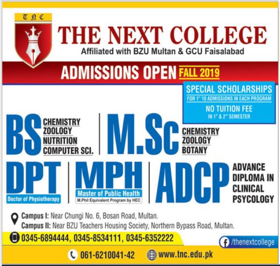 The Next College Multan has announced admissions for BS in Chemistry, Zoology, Computer science, Nutrition, DPT Doctor of Physical Therapy, MSc in Chemistry, Zoology, Botany, ADCP Advance Diploma in Clinical Psychology. Scholarships are available.