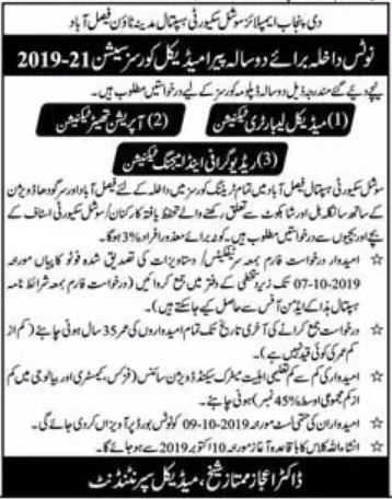 The Punjab Employees Social Security Hospital Faisalabad has announced admissions for Para Medical Diploma Courses in Medical Laboratory Technician, Operation Theater Technician, Radiography and Imaging Technician. Last date for submission of admission applications is 07 Oct 2019. Display of Merit list date is 09 Oct 2019.