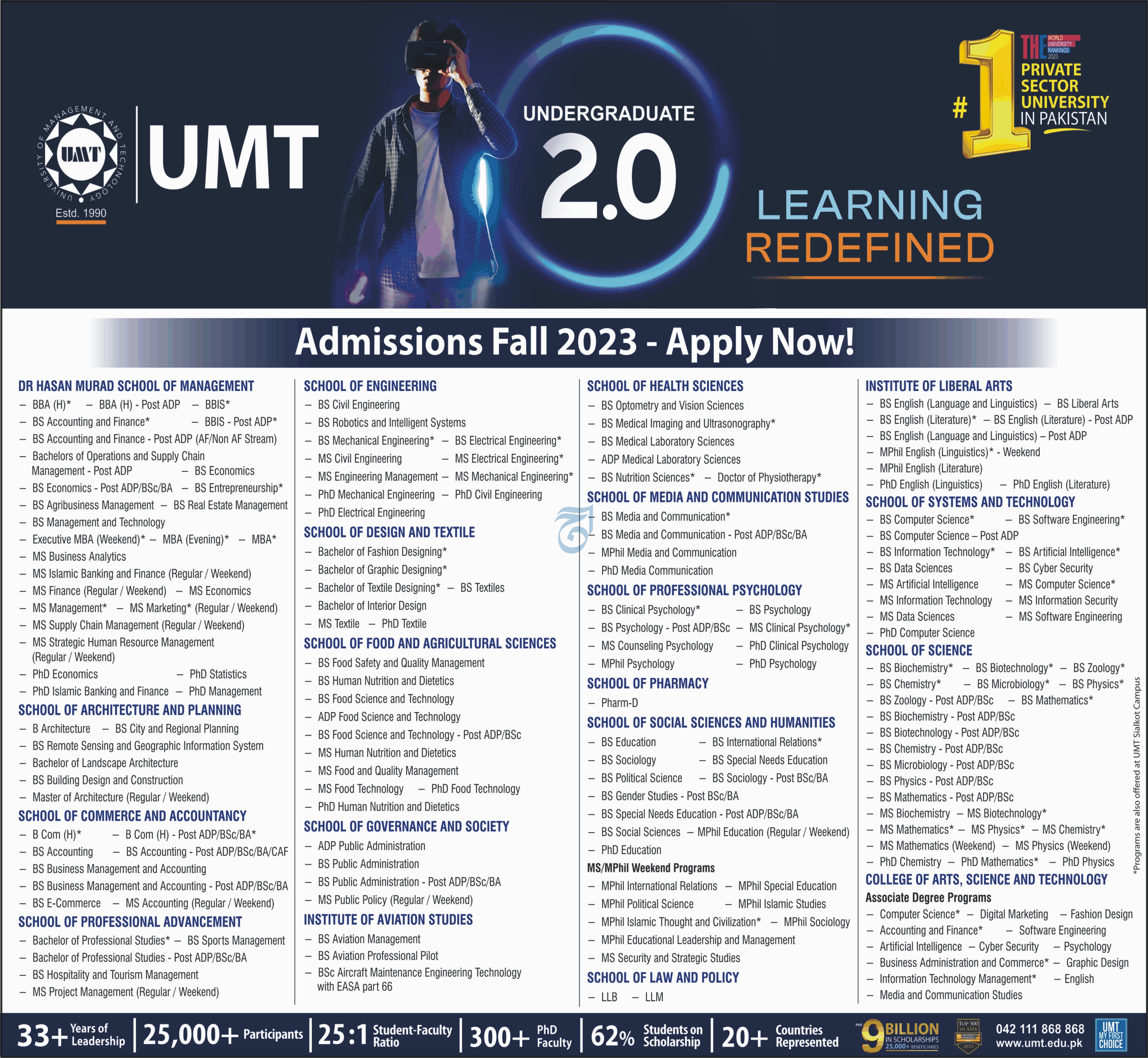 The University of Management and Technology UMT, a renowned private sector university in Pakistan, is once again set to redefine the landscape of higher education with its admissions for the Fall 2023 intake. UMTs diverse range of undergraduate and postgraduate programs across various schools and disciplines makes it a hub of educational excellence. Whether youre passionate about engineering, health sciences, design, agriculture, or social sciences, UMT has something for everyone.