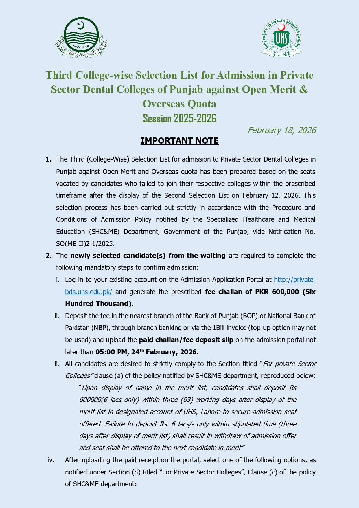 Aspiring dental students across Punjab have received a crucial update as University of Health Sciences Lahore UHS has officially announced the third college wise selection list for admission in private sector dental colleges of Punjab against open merit & overseas quota session 2025-2026. The release of the selection list of BDS candidates has generated significant excitement among applicants who have been closely tracking UHS admissions 2026 and waiting for the next round of confirmations.