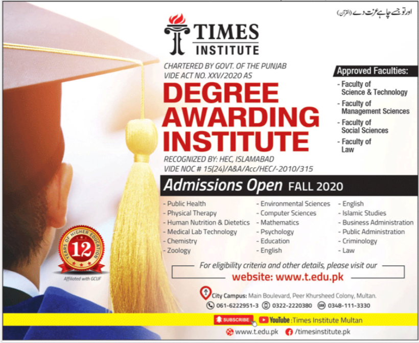 Times Institute has announced admissions 2020 in BS Public Health, BS Medical Lab Technology, BS Chemistry, BS Zoology, BS Computer Science, BS Mathematics, BS Psychology, BS Education, BS English, BS Islamic Studies, BS Business Administration, BS Law in Multan.