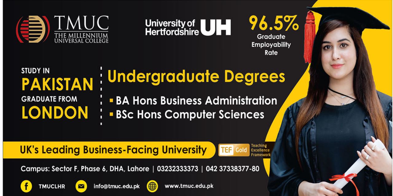 The Millennium Universal College TMUC invites applications for admissions in BA Hons Business Administration, B.Sc Hons Computer Sciences in Lahore. TMUC will awarded degree of University of Hertfordshire London.