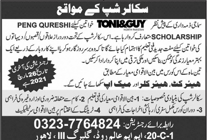 TONI&GUY South Pakistan Karachi is inviting Applications for Admissions in Peng Qureshi Scholarship for women for session 2021. According to this Scholarship candidates will be trained for haircut, Hair color and make up under duration of 3 months for session 2021. Last date for Registration is March 26, 2021. Admissions are open.